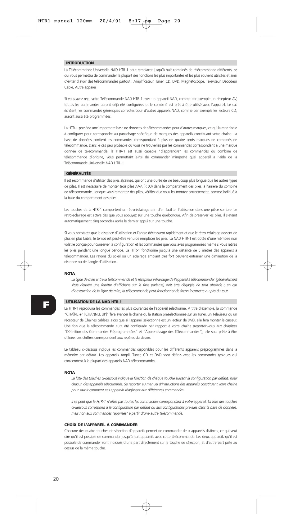 HTR1 manual 120mm 20/4/01 8:17 pm Page 20 INTRODUCTION La Télécommande Universelle NAD HTR-1 peut remplacer jusqu’à huit combinés de télécommande différents, ce qui vous permettra de commander la plupart des fonctions les plus importantes et les plus souvent utilisées et ainsi d’éviter d’avoir des télécommandes partout : Amplificateur, Tuner, CD, DVD, Magnétoscope, Téléviseur, Décodeur Câble, Autre appareil. Si vous avez reçu votre Télécommande NAD HTR-1 avec un appareil NAD, comme par exemple un récepteur AV, toutes les commandes auront déjà été configurées et le combiné est prêt à être utilisé avec l’appareil. Le cas échéant, les commandes génériques correctes pour d’autres appareils NAD, comme par exemple les lecteurs CD, auront aussi été programmées. La HTR-1 possède une importante base de données de télécommandes pour d’autres marques, ce qui la rend facile à configurer pour correspondre au panachage spécifique de marques des appareils constituant votre chaîne. La base de données contient les commandes correspondant à plus de quatre cents marques de combinés de télécommande. Dans le cas peu probable où vous ne trouveriez pas les commandes correspondant à une marque donnée de télécommande, la HTR-1 est aussi capable “d’apprendre” les commandes du combiné de télécommande d’origine, vous permettant ainsi de commander n’importe quel appareil à l’aide de la Télécommande Universelle NAD HTR–1.