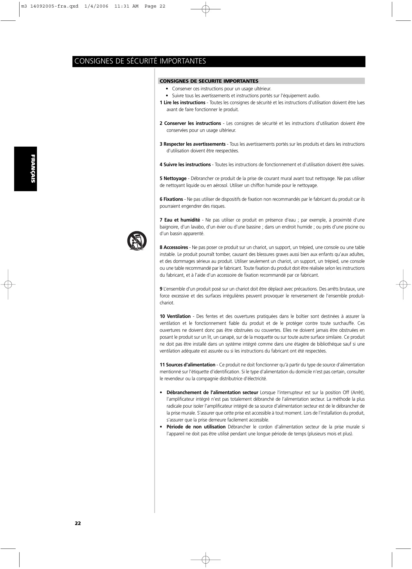 + Conserver ces instructions pour un usage ultérieur. + Suivre tous les avertissements et instructions portés sur l'équipement audio. 1 Lire les instructions - Toutes les consignes de sécurité et les instructions d'utilisation doivent être lues avant de faire fonctionner le produit. 2 Conserver les instructions - Les consignes de sécurité et les instructions d'utilisation doivent être conservées pour un usage ultérieur. 3 Respecter les avertissements - Tous les avertissements portés sur les produits et dans les instructions d'utilisation doivent être reespectées 4 Suivre les instructions - Toutes les instructions de fonctionnement et d'utilisation doivent être suivies. 5 Nettoyage - Débrancher ce produit de la prise de courant mural avant tout nettoyage. Ne pas utiliser de nettoyant liquide ou en aérosol. Utiliser un chiffon humide pour le nettoyage 6 Fixations - Ne pas utiliser de dispositifs de fixation non recommandés par le fabricant du produit car ils pourraient engendrer des risques 7 Eau et humidité - Ne pas utiliser ce produit en présence d'eau ; par exemple, à proximité d'une baignoire, d'un lavabo, d'un évier ou d'une bassine ; dans un endroit humide ; ou près d'une piscine ou d'un bassin apparenté. 8 Accessoires - Ne pas poser ce produit sur un chariot, un support, un trépied, une console ou une table instable. Le produit pourraît tomber, causant des blessures graves aussi bien aux enfants qu'aux adultes, et des dommages sérieux au produit. Utiliser seulement un chariot, un support, un trépied, une console ou une table recommandé par le fabricant. Toute fixation du produit doit être réalisée selon les instructions du fabricant, et à l'aide d'un accessoire de fixation recommandé par ce fabricant 9 L'ensemble d'un produit posé sur un chariot doit être déplacé avec précautions. Des arrêts brutaux, une force excessive et des surfaces irrégulières peuvent provoquer le renversement de l'ensemble produit- chariot 10 Ventilation - Des fentes et des ouvertures pratiquées dans le boîtier sont destinées à assurer la ventilation et le fonctionnement fiable du produit et de le protéger contre toute surchauffe. Ces ouvertures ne doivent donc pas être obstruées ou couvertes. Elles ne doivent jamais être obstruées en posant le produit sur un lit, un canapé, sur de la moquette ou sur toute autre surface similaire. Ce produit ne doit pas être installé dans un système intégré comme dans une étagère de bibliothéque sauf si une ventilation adéquate est assurée ou si les instructions du fabricant ont été respectées 11 Sources d'alimentation - Ce produit ne doit fonctionner qu'à partir du type de source d'alimentation mentionné sur l'étiquette d'identification. Si le type d'alimentation du domicile n'est pas certain, consulter le revendeur ou la compagnie distributrice d'électricité. + Débranchement de l'alimentation secteur Lorsque l'interrupteur est sur la position Off (Arrët), l'amplificateur intégré n'est pas totalement débranché de l'alimentation secteur. La méthode la plus radicale pour isoler l'amplificateur intégré de sa source d'alimentation secteur est de le débrancher de la prise murale. S'assurer que cette prise est accessible à tout moment. Lors de l'installation du produit, s'assurer que la prise demeure facilement accessible. + Période de non utilisation Débrancher le cordon d'alimentation secteur de la prise murale si l'appareil ne doit pas être utilisé pendant une longue période de temps (plusieurs mois et plus)
