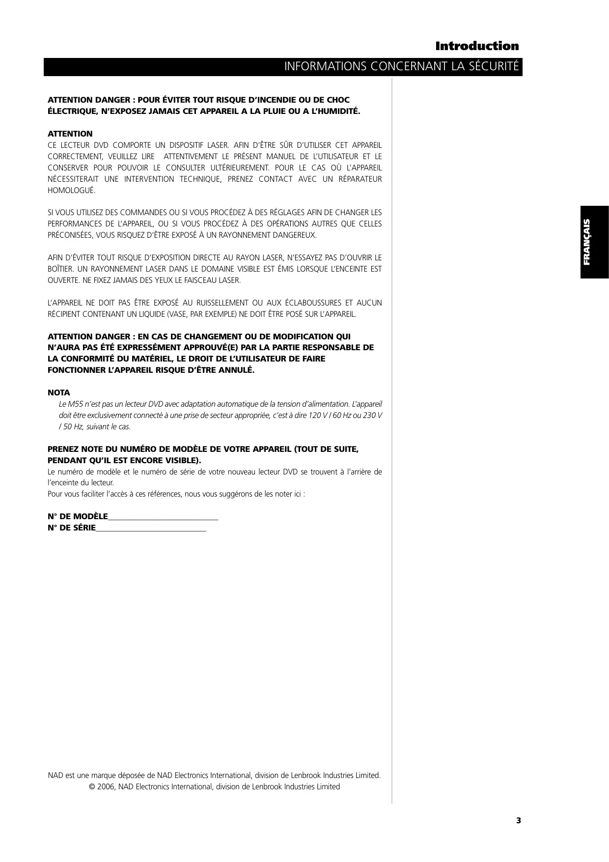 Ce produit comporte une technologie de protection contre les violations de copyright par une méthode faisant l’objet de brevets américains et d’autres droits sur la propriété intellectuelle appartenant à la Macrovision Corporation et à d’autres détenteurs de droits. L’utilisation de cette technologie de protection contre les violations de copyright doit être autorisée par la Macrovision Corporation et est destinée uniquement aux séances à domicile ou aux séances autrement restreintes, sauf en cas de permission explicitement accordée par la Macrovision Corporation. Tout démontage ou décodage sont interdits. FRANÇAIS NOUS INFORMONS LE CONSOMMATEUR QUE TOUS LES TÉLÉVISEURS HAUTE DÉFINITION NE SONT PAS TOTALEMENT COMPATIBLES AVEC CE PRODUIT ET QUE, DANS CERTAINS CAS, IL ARRIVE QUE DES PARASITES SOIENT VISIBLES À L’ÉCRAN. EN CAS DE PROBLÈMES AVEC L’IMAGE EN BALAYAGE PROGRESSIF SUR LE M5, NOUS PRÉCONISONS L’UTILISATION DE LA SORTIE ENTRELACÉE “DÉFINITION STANDARD” POUR LA CONNEXION. SI VOUS AVEZ DES QUESTIONS CONCERNANT LA COMPATIBILITÉ DE VOTRE TÉLÉVISEUR AVEC CE LECTEUR DE DVD MODÈLE M55, VEUILLEZ CONTACTER LE SERVICE CLIENTÈLE INTERNATIONAL DE NAD ELECTRONICS, +1 905 831 0799. DEUTSCH La loi interdit toute copie, diffusion, représentation par câble, présentation en public ou location des œuvres protégées par copyright, sans permission. Les disques DVD vidéo sont protégés contre la contrefaçon, donc tout enregistrement fait à partir de ces disques sera déformé. Ce produit comporte une technologie de protection contre les violations de copyright par une méthode faisant l’objet de brevets américains et d’autres droits sur la propriété intellectuelle appartenant à la Macrovision Corporation et à d’autres détenteurs de droits. L’utilisation de cette technologie de protection contre les violations de copyright doit être autorisée par la Macrovision Corporation et est destinée uniquement aux séances à domicile ou autrement restreintes, sauf en cas de permission explicitement accordée par la Macrovision Corporation. Tout démontage ou décodage sont interdits. NEDERLANDS