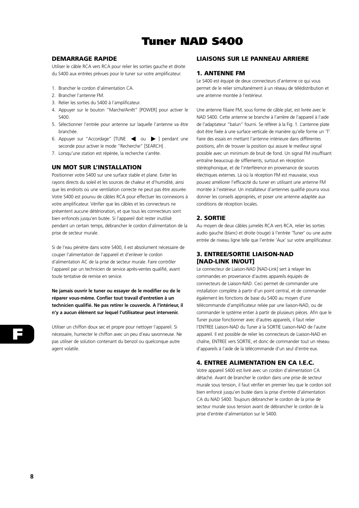 Votre S400 est pourvu de câbles RCA pour effectuer les connexions à votre amplificateur. Vérifier que les câbles et les connecteurs ne présentent aucune détérioration, et que tous les connecteurs sont bien enfoncés jusqu’en butée. Si l’appareil doit rester inutilisé pendant un certain temps, débrancher le cordon d’alimentation de la prise de secteur murale. Si de l’eau pénètre dans votre S400, il est absolument nécessaire de couper l’alimentation de l’appareil et d’enlever le cordon d’alimentation AC de la prise de secteur murale. Faire contrôler l’appareil par un technicien de service après-ventes qualifié, avant toute tentative de remise en service. Ne jamais ouvrir le tuner ou essayer de le modifier ou de le réparer vous-même. Confier tout travail d’entretien à un technicien qualifié. Ne pas retirer le couvercle. A l’intérieur, il n’y a aucun élément sur lequel l’utilisateur peut intervenir. Utiliser un chiffon doux sec et propre pour nettoyer l’appareil. Si nécessaire, humecter le chiffon avec un peu d’eau savonneuse. Ne pas utiliser de solution contenant du benzol ou quelconque autre agent volatile.