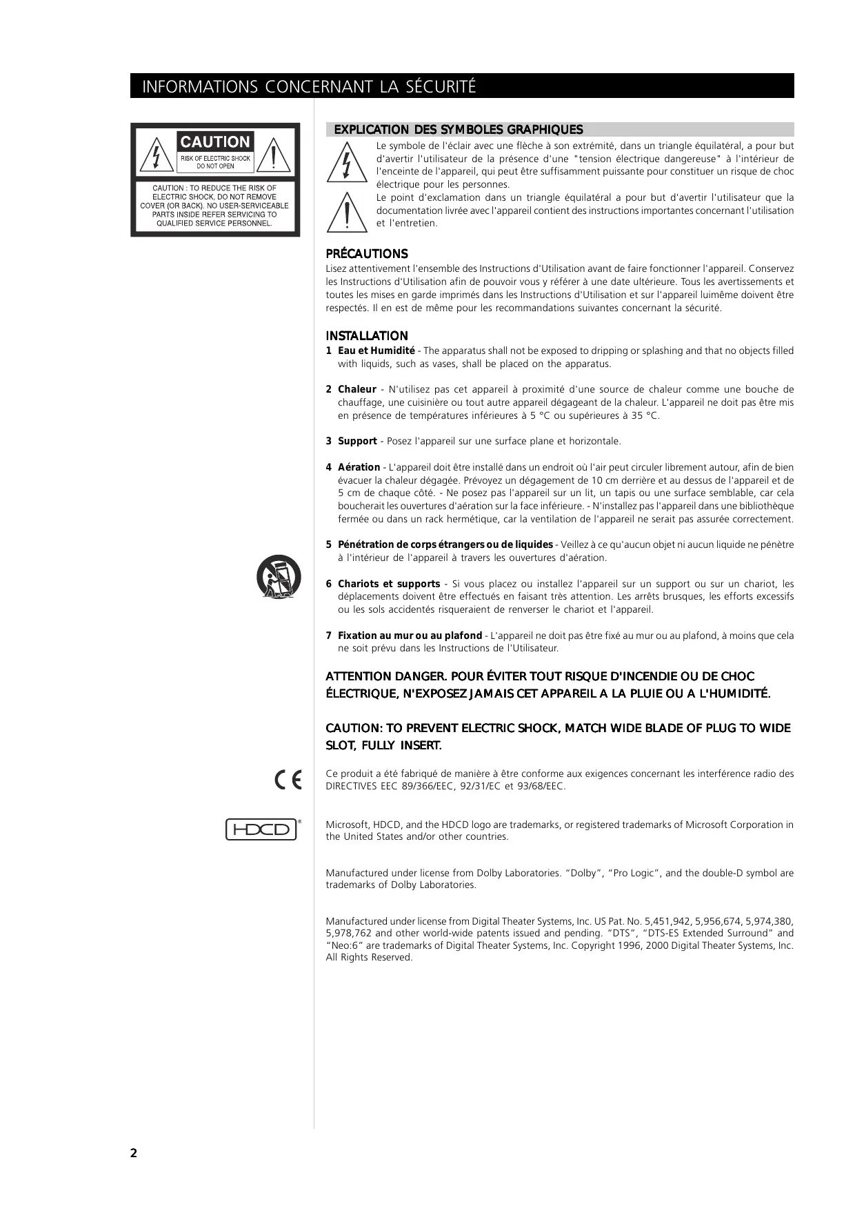 Attention DANGER. pour éviter tout RISQUE d'incendie ou de CHOC électrique, n'exposez JAMAIS cet appareil a la PLUIE ou a l'humidite.