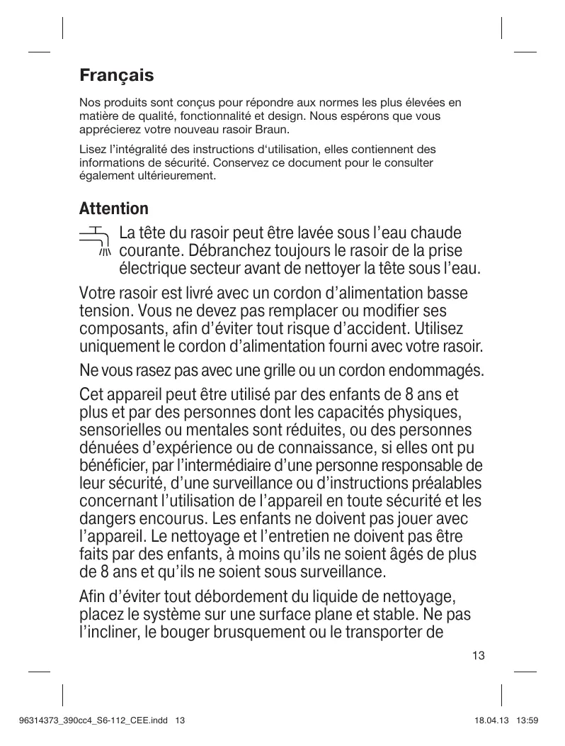 Français Nos produits sont conçus pour répondre aux normes les plus élevées en matière de qualité, fonctionnalité et design. Nous espérons que vous apprécierez votre nouveau rasoir Braun. Lisez l’intégralité des instructions d‘utilisation, elles contiennent des informations de sécurité. Conservez ce document pour le consulter également ultérieurement. Attention La tête du rasoir peut être lavée sous l’eau chaude courante. Débranchez toujours le rasoir de la prise électrique secteur avant de nettoyer la tête sous l’eau. Votre rasoir est livré avec un cordon d’alimentation basse tension. Vous ne devez pas remplacer ou modifier ses composants, afin d’éviter tout risque d’accident. Utilisez uniquement le cordon d’alimentation fourni avec votre rasoir. Ne vous rasez pas avec une grille ou un cordon endommagés. Cet appareil peut être utilisé par des enfants de 8 ans et plus et par des personnes dont les capacités physiques, sensorielles ou mentales sont réduites, ou des personnes dénuées d’expérience ou de connaissance, si elles ont pu bénéficier, par l’intermédiaire d’une personne responsable de leur sécurité, d’une surveillance ou d’instructions préalables concernant l’utilisation de l’appareil en toute sécurité et les dangers encourus. Les enfants ne doivent pas jouer avec l’appareil. Le nettoyage et l’entretien ne doivent pas être faits par des enfants, à moins qu’ils ne soient âgés de plus de 8 ans et qu’ils ne soient sous surveillance. Afin d’éviter tout débordement du liquide de nettoyage, placez le système sur une surface plane et stable. Ne pas l’incliner, le bouger brusquement ou le transporter de