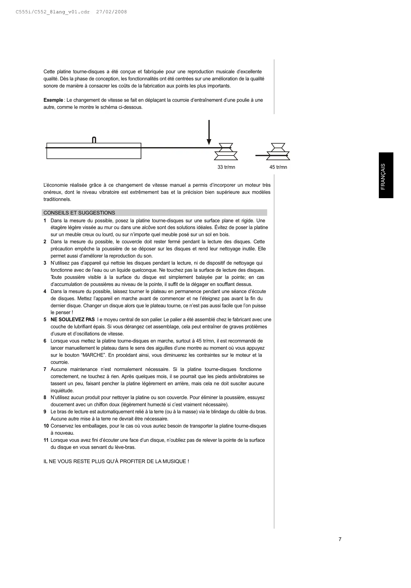2 Dans la mesure du possible, le couvercle doit rester fermé pendant la lecture des disques. Cette précaution empêche la poussière de se déposer sur les disques et rend leur nettoyage inutile. Elle permet aussi d’améliorer la reproduction du son. 3 N’utilisez pas d’appareil qui nettoie les disques pendant la lecture, ni de dispositif de nettoyage qui fonctionne avec de l’eau ou un liquide quelconque. Ne touchez pas la surface de lecture des disques. Toute poussière visible à la surface du disque est simplement balayée par la pointe; en cas d’accumulation de poussières au niveau de la pointe, il suffit de la dégager en soufflant dessus. 4 Dans la mesure du possible, laissez tourner le plateau en permanence pendant une séance d’écoute de disques. Mettez l’appareil en marche avant de commencer et ne l’éteignez pas avant la fin du dernier disque. Changer un disque alors que le plateau tourne, ce n’est pas aussi facile que l’on puisse le penser ! 5 NE SOULEVEZ PAS l e moyeu central de son palier. Le palier a été assemblé chez le fabricant avec une couche de lubrifiant épais. Si vous dérangez cet assemblage, cela peut entraîner de graves problèmes d’usure et d’oscillations de vitesse. 6 Lorsque vous mettez la platine tourne-disques en marche, surtout à 45 tr/mn, il est recommandé de lancer manuellement le plateau dans le sens des aiguilles d’une montre au moment où vous appuyez sur le bouton “MARCHE”. En procédant ainsi, vous diminuerez les contraintes sur le moteur et la courroie. 7 Aucune maintenance n’est normalement nécessaire. Si la platine tourne-disques fonctionne correctement, ne touchez à rien. Après quelques mois, il se pourrait que les pieds antivibratoires se tassent un peu, faisant pencher la platine légèrement en arrière, mais cela ne doit susciter aucune inquiétude. 8 N’utilisez aucun produit pour nettoyer la platine ou son couvercle. Pour éliminer la poussière, essuyez doucement avec un chiffon doux (légèrement humecté si c’est vraiment nécessaire). 9 Le bras de lecture est automatiquement relié à la terre (ou à la masse) via le blindage du câble du bras. Aucune autre mise à la terre ne devrait être nécessaire. 10 Conservez les emballages, pour le cas où vous auriez besoin de transporter la platine tourne-disques à nouveau. 11 Lorsque vous avez fini d’écouter une face d’un disque, n’oubliez pas de relever la pointe de la surface du disque en vous servant du lève-bras. IL NE VOUS RESTE PLUS QU’À PROFITER DE LA MUSIQUE !