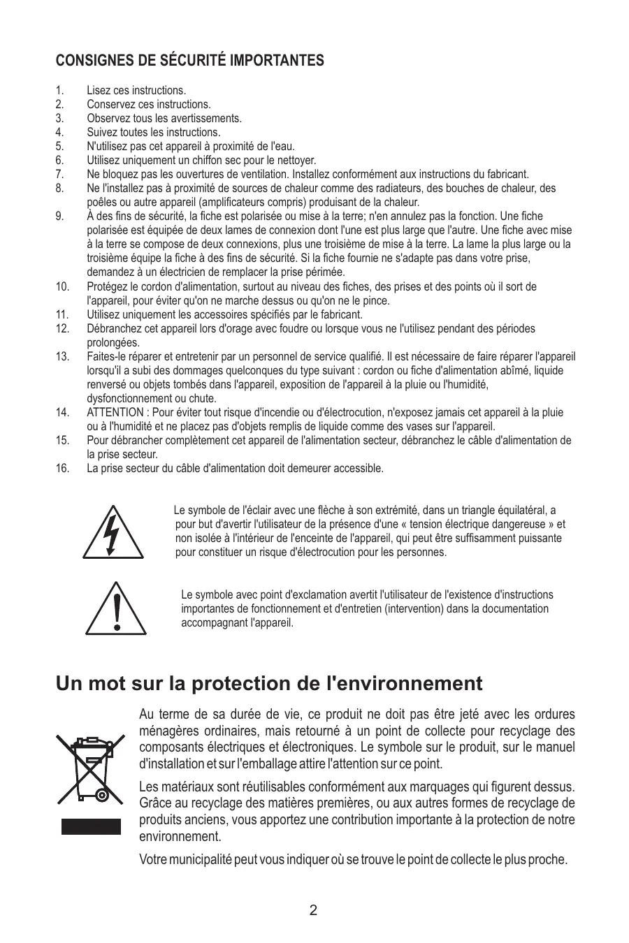 Le symbole de l'éclair avec une flèche à son extrémité, dans un triangle équilatéral, a pour but d'avertir l'utilisateur de la présence d'une « tension électrique dangereuse » et non isolée à l'intérieur de l'enceinte de l'appareil, qui peut être suffisamment puissant pour constituer un risque d'électrocution pour les personnes.