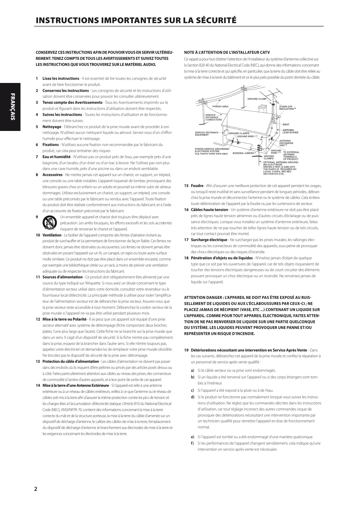Lisez les instructions - Il est essentiel de lire toutes les consignes de sécurité avant de faire fonctionner le produit. Conservez les instructions - Les consignes de sécurité et les instructions d’utilisation doivent être conservées pour pouvoir les consulter ultérieurement. Tenez compte des Avertissements - Tous les Avertissements imprimés sur le produit et figurant dans les instructions d’utilisation doivent être respectés. Suivez les instructions - Toutes les instructions d’utilisation et de fonctionnement doivent être suivies. Nettoyage - Débranchez ce produit de la prise murale avant de procéder à son nettoyage. N’utilisez aucun nettoyant liquide ou aérosol. Servez-vous d’un chiffon humide pour effectuer le nettoyage. Fixations - N’utilisez aucune fixation non recommandée par le fabricant du produit, car cela peut entraîner des risques. Eau et humidité - N’utilisez pas ce produit près de l’eau, par exemple près d’une baignoire, d’un lavabo, d’un évier ou d’un bac à lessive. Ne l’utilisez pas non plus dans une cave humide, près d’une piscine ou dans un endroit semblable. Accessoires - Ne mettez jamais cet appareil sur un chariot, un support, un trépied, une console ou une table instables. L’appareil risquerait de tomber, provoquant des blessures graves chez un enfant ou un adulte et pourrait lui-même subir de sérieux dommages. Utilisez exclusivement un chariot, un support, un trépied, une console ou une table préconisés par le fabricant ou vendus avec l’appareil. Toute fixation du produit doit être réalisée conformément aux instructions du fabricant, et à l’aide d’un accessoire de fixation préconisé par le fabricant. Un ensemble appareil et chariot doit toujours être déplacé avec précaution. Les arrêts brusques, les efforts excessifs et les sols accidentés risquent de renverser le chariot et l’appareil. Ventilation - Le boîtier de l’appareil comporte des fentes d’aération évitant au produit de surchauffer et lui permettant de fonctionner de façon fiable. Ces fentes ne doivent donc jamais être obstruées ou recouvertes. Les fentes ne doivent jamais être obstruées en posant l’appareil sur un lit, un canapé, un tapis ou toute autre surface molle similaire. Ce produit ne doit pas être placé dans un ensemble encastré, comme par exemple une bibliothèque vitrée ou un rack, à moins de prévoir une ventilation adéquate ou de respecter les instructions du fabricant. Sources d’alimentation - Ce produit doit obligatoirement être alimenté par une source du type indiqué sur l’étiquette. Si vous avez un doute concernant le type d’alimentation secteur utilisé dans votre domicile, consultez votre revendeur ou le fournisseur local d’électricité. La principale méthode à utiliser pour isoler l’amplificateur de l’alimentation secteur est de débrancher la prise secteur. Assurez-vous que la prise secteur reste accessible à tout moment. Débranchez le cordon secteur de la prise murale si l’appareil ne va pas être utilisé pendant plusieurs mois. Mise à la terre ou Polarité - Il se peut que cet appareil soit équipé d’une prise secteur alternatif avec système de détrompage (fiche comportant deux broches plates, l’une plus large que l’autre). Cette fiche ne se branche sur la prise murale que dans un sens. Il s’agit d’un dispositif de sécurité. Si la fiche n’entre pas complètement dans la prise, essayez de la brancher dans l’autre sens. Si elle n’entre toujours pas, appelez votre électricien et demandez-lui de remplacer votre prise murale obsolète. Ne bricolez pas le dispositif de sécurité de la prise avec détrompage. Protection du câble d’alimentation - Les câbles d’alimentation ne doivent pas passer dans des endroits où ils risquent d’être piétinés ou pincés par des articles posés dessus ou à côté. Faites particulièrement attention aux câbles au niveau des prises, des connecteurs de commodité à l’arrière d’autres appareils, et à leur point de sortie de cet appareil. Mise à la terre d’une Antenne Extérieure - Si l’appareil est relié à une antenne extérieure ou à un réseau de câbles extérieurs, veillez à ce que l’antenne ou le réseau de câbles soit mis à la terre afin d’assurer la même protection contre les pics de tension et les charges liées à l’accumulation d’électricité statique. L’Article 810 du National Electrical Code (NEC), ANSI/NFPA 70, contient des informations concernant la mise à la terre correcte du mât et de la structure porteuse, la mise à la terre du câble d’amenée sur un dispositif de décharge d’antenne, le calibre des câbles de mise à la terre, l’emplacement du dispositif de décharge d’antenne, le branchement aux électrodes de mise à la terre et les exigences concernant les électrodes de mise à la terre. NOTE À L’ATTENTION DE L’INSTALLATEUR CATV Ce rappel a pour but d’attirer l’attention de l’installateur du système d’antenne collective sur la Section 820 40 du National Electrical Code (NEC), qui donne des informations concernant la mise à la terre correcte et qui spécifie, en particulier, que la terre du câble doit être reliée au système de mise à la terre du bâtiment et ce le plus près possible du point d’entrée du câble. 15 Foudre - Afin d’assurer une meilleure protection de cet appareil pendant les orages, ou lorsqu’il reste inutilisé et sans surveillance pendant de longues périodes, débranchez la prise murale et déconnectez l’antenne ou le système de câbles. Cela évitera toute détérioration de l’appareil par la foudre ou par les surtensions de secteur. 16 Câbles haute tension - Un système d’antenne extérieure ne doit pas être placé près de lignes haute tension aériennes ou d’autres circuits d’éclairage ou de puissance électriques. Lorsque vous installez un système d’antenne extérieure, faites