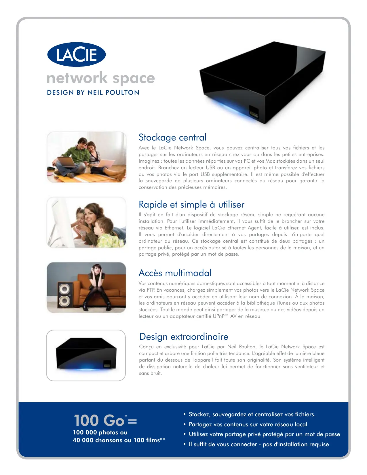 Stockage central Avec le LaCie Network Space, vous pouvez centraliser tous vos fichiers et les partager sur les ordinateurs en réseau chez vous ou dans les petites entreprises. Imaginez : toutes les données réparties sur vos PC et vos Mac stockées dans un seul endroit. Branchez un lecteur USB ou un appareil photo et transférez vos fichiers ou vos photos via le port USB supplémentaire. Il est même possible d'effectuer la sauvegarde de plusieurs ordinateurs connectés au réseau pour garantir la conservation des précieuses mémoires. Rapide et simple à utiliser Il s'agit en fait d'un dispositif de stockage réseau simple ne requérant aucune installation. Pour l'utiliser immédiatement, il vous suffit de le brancher sur votre réseau via Ethernet. Le logiciel LaCie Ethernet Agent, facile à utiliser, est inclus. Il vous permet d'accéder directement à vos partages depuis nimporte quel ordinateur du réseau. Ce stockage central est constitué de deux partages : un partage publie, pour un accès autorisé à toutes les personnes de la maison, et un partage privé, protégé par un mot de passe. Accès multimodal Vos contenus numériques domestiques sont accessibles à tout moment et à distance via FTP En vacances, chargez simplement vos photos vers le LaCie Network Space et vos amis pourront y accéder en utilisant leur nom de connexion. À la maison, les ordinateurs en réseau peuvent accéder à la bibliothèque iTunes ou aux photos stockées. Tout le monde peut ainsi partager de la musique ou des vidéos depuis un lecteur ou un adaptateur certifié UPnP"* AV en réseau. Design extraordinaire Conçu en exclusivité pour LaCie par Neil Poulton, le LaCie Network Space est compact et arbore une finition polie très tendance. L'agréable effet de lumière bleue partant du dessous de l'appareil fait toute son originalité. Son système intelligent de dissipation naturelle de chaleur lui permet de fonctionner sans ventilateur et sans bruit 1 00 le 5 Stockez, sauvegardez et centralisez vos fichiers. [e) — Partagez vos contenus sur votre réseau local 100 000 photos ou Utilisez votre partage privé protégé par un mot de passe 40 000 chansons ou 100 films** Il suffit de vous connecter - pas d'installation requise