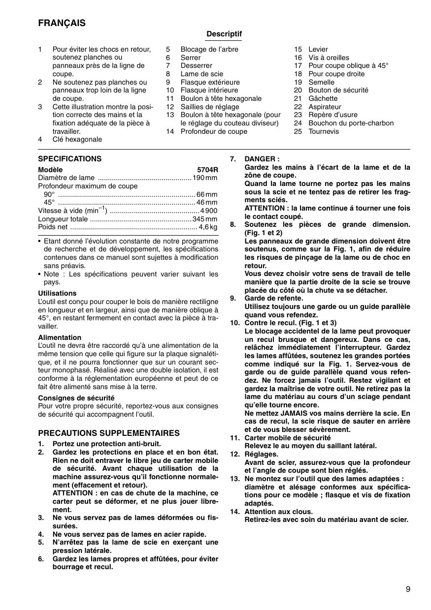 Gardez les mains à l’écart de la lame et de la zône de coupe. Quand la lame tourne ne portez pas les mains sous la scie et ne tentez pas de retirer les fragments sciés. ATTENTION : la lame continue á tourner une fois le contact coupé. Soutenez les pièces de grande dimension. (Fig. 1 et 2) Les panneaux de grande dimension doivent être soutenus, comme sur la Fig. 1, afin de réduire les risques de pinçage de la lame ou de choc en retour. Vous devez choisir votre sens de travail de telle manière que la partie droite de la scie se trouve placée du côté où la chute va se détacher. Garde de refente. Utilisez toujours une garde ou un guide parallèle quand vous refendez. Contre le recul. (Fig. 1 et 3) Le blocage accidentel de la lame peut provoquer un recul brusque et dangereux. Dans ce cas, relâchez immédiatement l’interrupteur. Gardez les lames affûtées, soutenez les grandes portées comme indiqué sur la Fig. 1. Servez-vous de garde ou de guide parallèle quand vous refendez. Ne forcez jamais l’outil. Restez vigilant et gardez la maîtrise de votre outil. Ne retirez pas la lame du matériau au cours d’un sciage pendant qu’elle tourne encore. Ne mettez JAMAIS vos mains derrière la scie. En cas de recul, la scie risque de sauter en arrière et de vous blesser sévèrement. Carter mobile de sécurité Relevez le au moyen du saillant latéral. Réglages. Avant de scier, assurez-vous que la profondeur et l’angle de coupe sont bien réglés. Ne montez sur l’outil que des lames adaptées : diamètre et alésage conformes aux spécifications pour ce modèle ; flasque et vis de fixation adaptés. Attention aux clous. Retirez-les avec soin du matériau avant de scier.