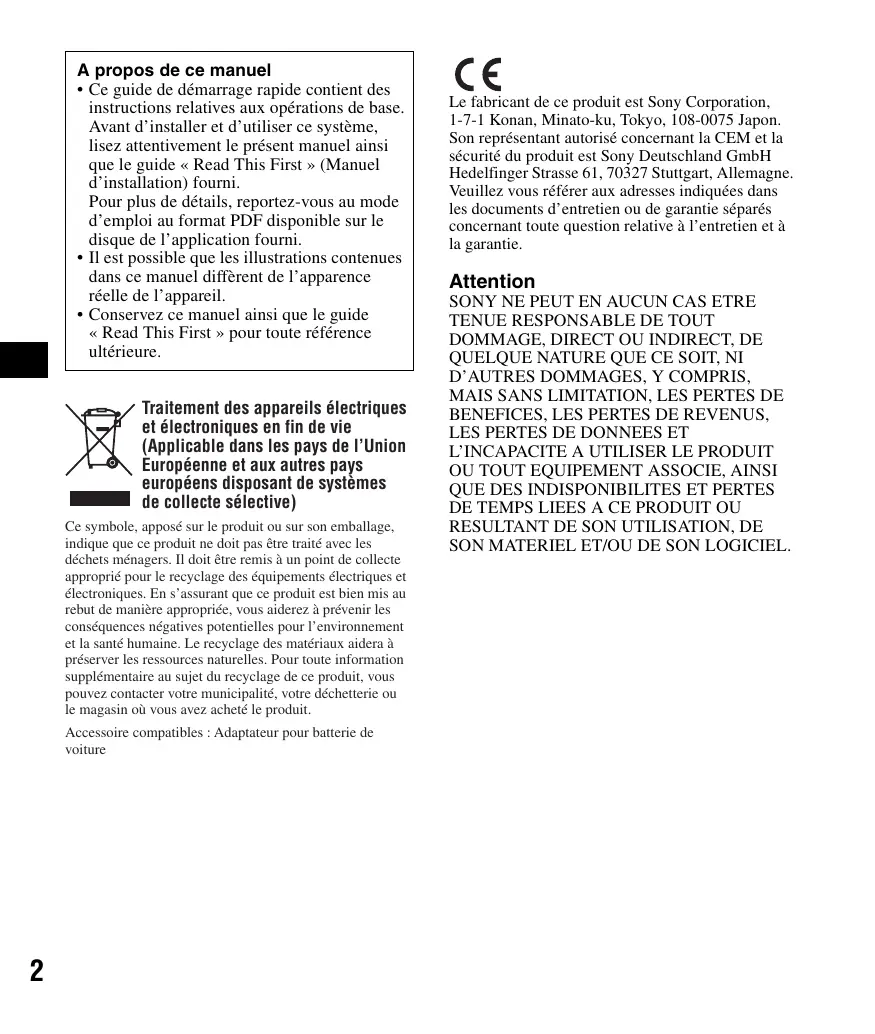 - Ce guide de démarrage rapide contient des instructions relatives aux opérations de base. Avant d’installer et d’utiliser ce système, lisez attentivement le présent manuel ainsi que le guide « Read This First » (Manuel d’installation) fourni. Pour plus de détails, reportez-vous au mode d’emploi au format PDF disponible sur le disque de l’application fourni.