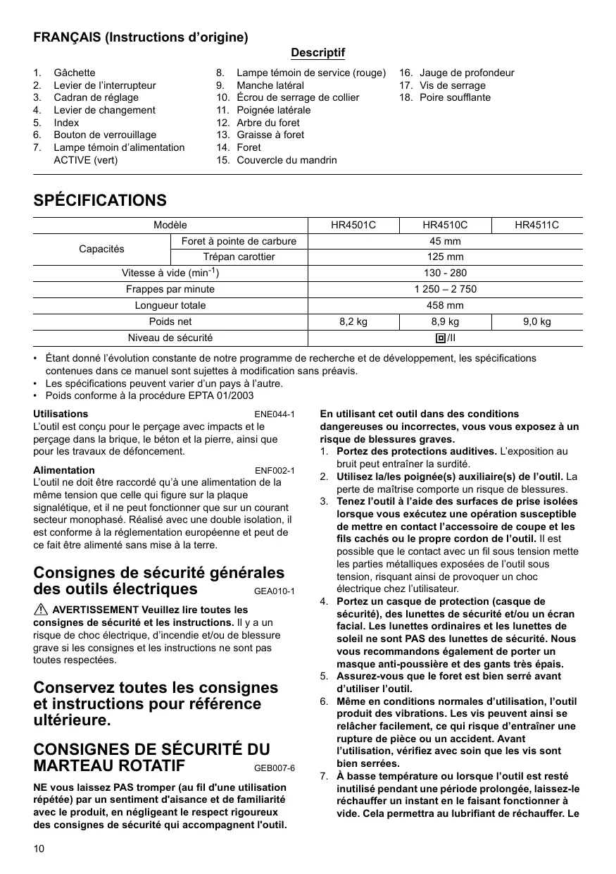 Retrouvez gratuitement la notice de l'appareil HR 4501 C MAKITA au format PDF.
