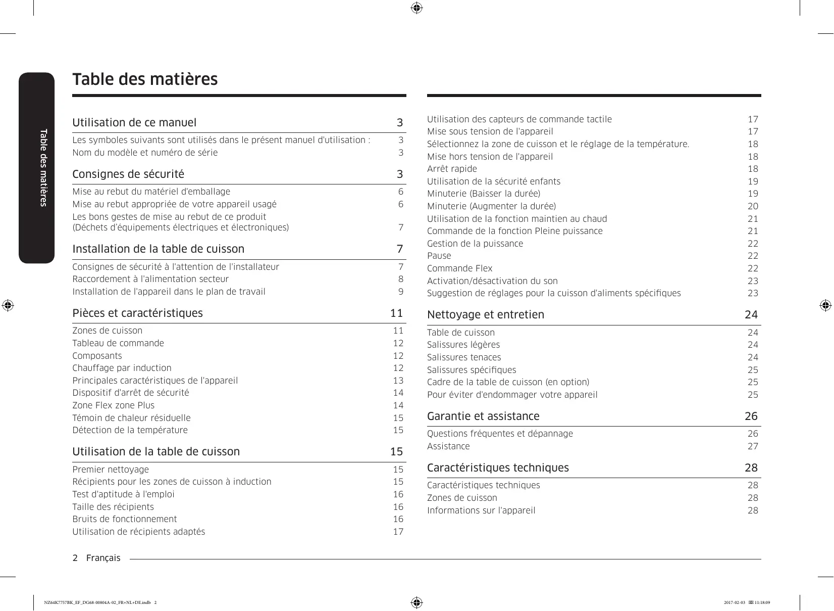 Table de cuisson à induction Manuel d'utilisation NZ64K7757BK NZ64K7757BK_EF_DG68-00804A-02_FR+NL+DE.indb 1 2017-02-03 11:18:09 Table des matières Table des matières Utilisation de ce manuel