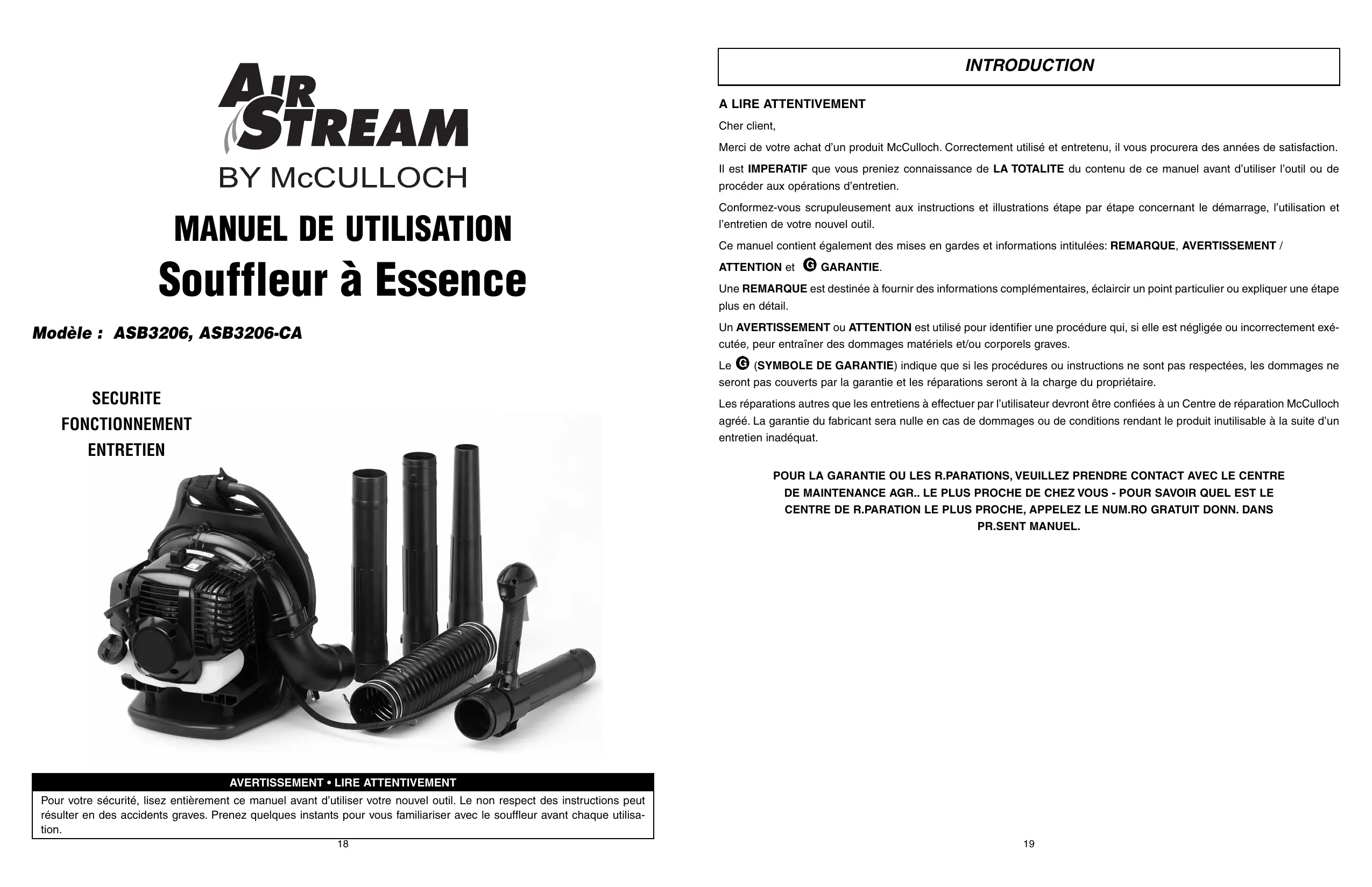 ASB3206 - Souffleur à dos à gazoline MCCULLOCH - Notice d'utilisation et mode d'emploi gratuit
