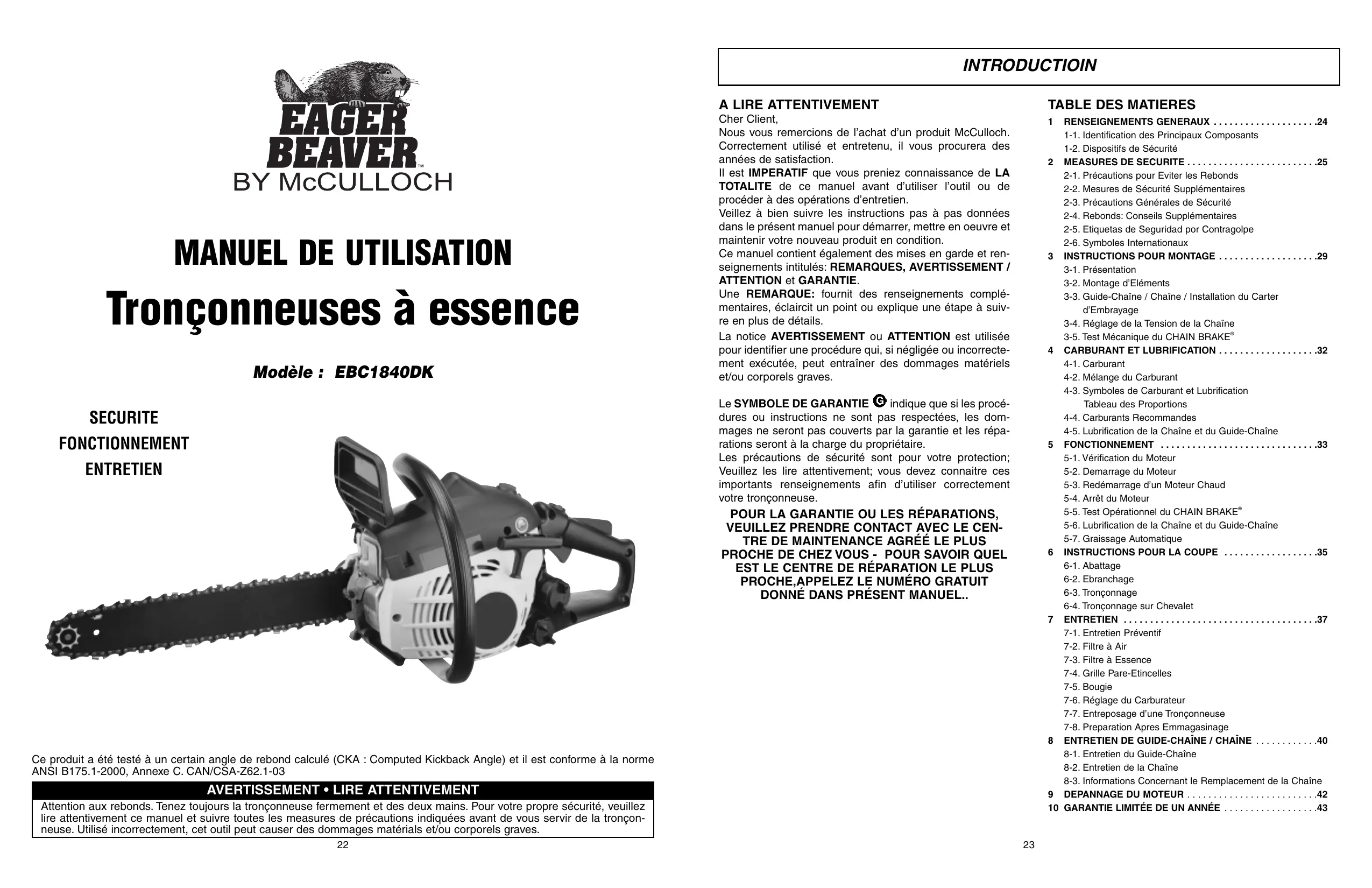 Nous vous remercions de l'achat d'un produit McCulloch. Correctement utilisé et entretenu, il vous procurera des années de satisfaction.