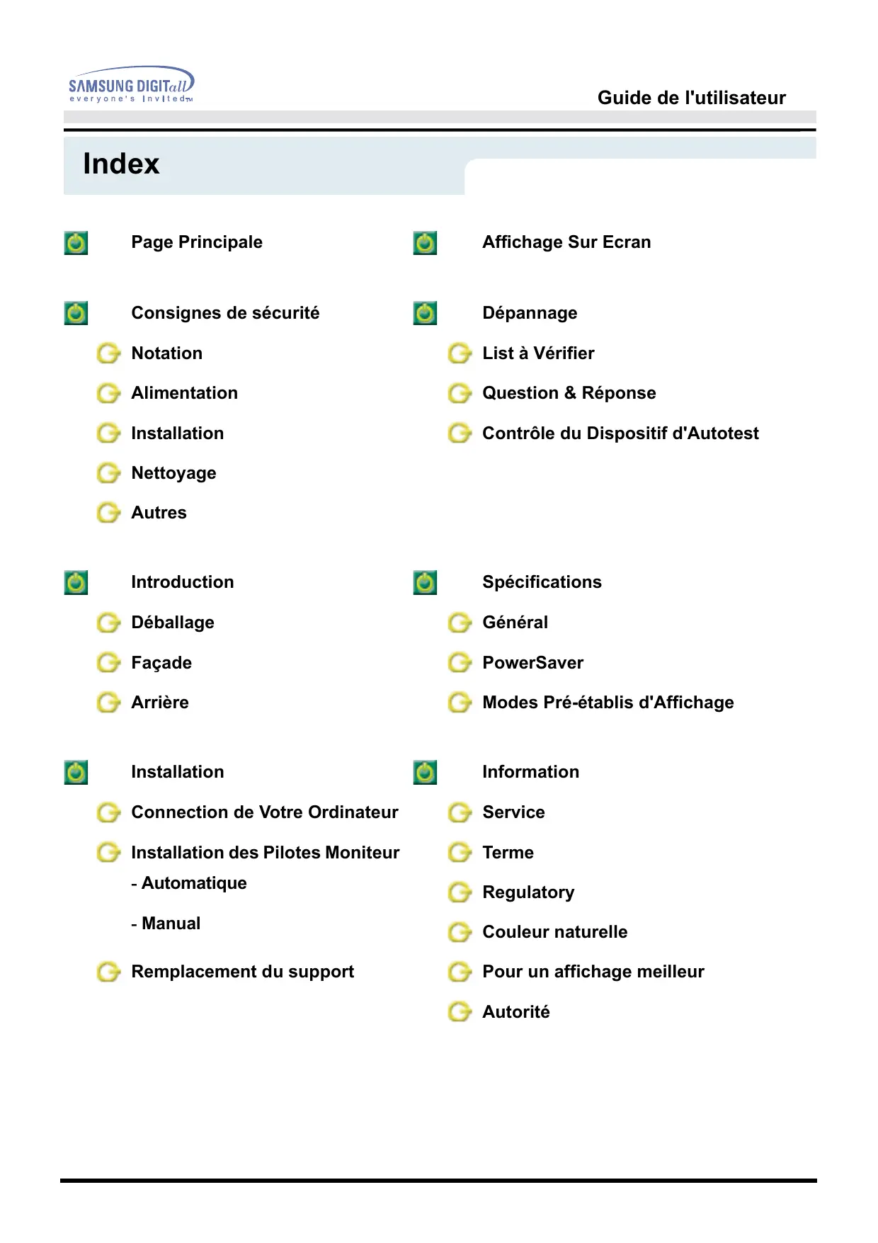 Si vous n'êtes pas satisfait de la qualité de l'image, vous pouvez améliorer l'affichage en exécutant la “fonction de réglage automatique“ sur l'écran qui s'affiche après avoir appuyé sur le bouton de fermeture de la fenêtre. Si le bruit subsiste après le réglage automatique, utilisez la fonction de réglage de la clarification (FINE/COARSE). Guide de l'utilisateur Information Autorité Les informations contenues dans ce document peuvent être soumises à des modifications sans préavis. © 2002 Samsung Electronics Co., Ltd. Tous droits résérvés. Toute reproduction par quelque moyen que ce soit , est strictement interdits sans l'autorisation écrite de Samsung Electronics Co., Ltd. Samsung Electronics Co., Ltd.n'est pas responsable pour des dommages s ou accidents pour une installation, pour une demonstration ou pour l'usage de ce matériel. Logo de Samsung sont des marques commerciales déposées de Samsung Electronics Co., Ltd.; "Microsoft", "Windows", "Windows NT" sont des marques commerciales déposées de Microsoft Corporation. "VESA", "DPMS" et "DDC" sont des marques commerciales déposées de Video Electronics Standard Association; Le nom et le logo d' "ENERGY STAR" sont des marques commerciales déposées de U.S. Environmental Protection Agency (EPA). En sa qualité de partenariat avec ENERGY STAR, Samsung Electronics Co., Ltd.affirme que ce produit répond aux directives de ENERGY STAR concernant l'économie de l'énergie. Tous les autres noms de produits mentionnés ci-dessous peuvent être les marques ou les marques déposées de leurs propriétaire respectifs.