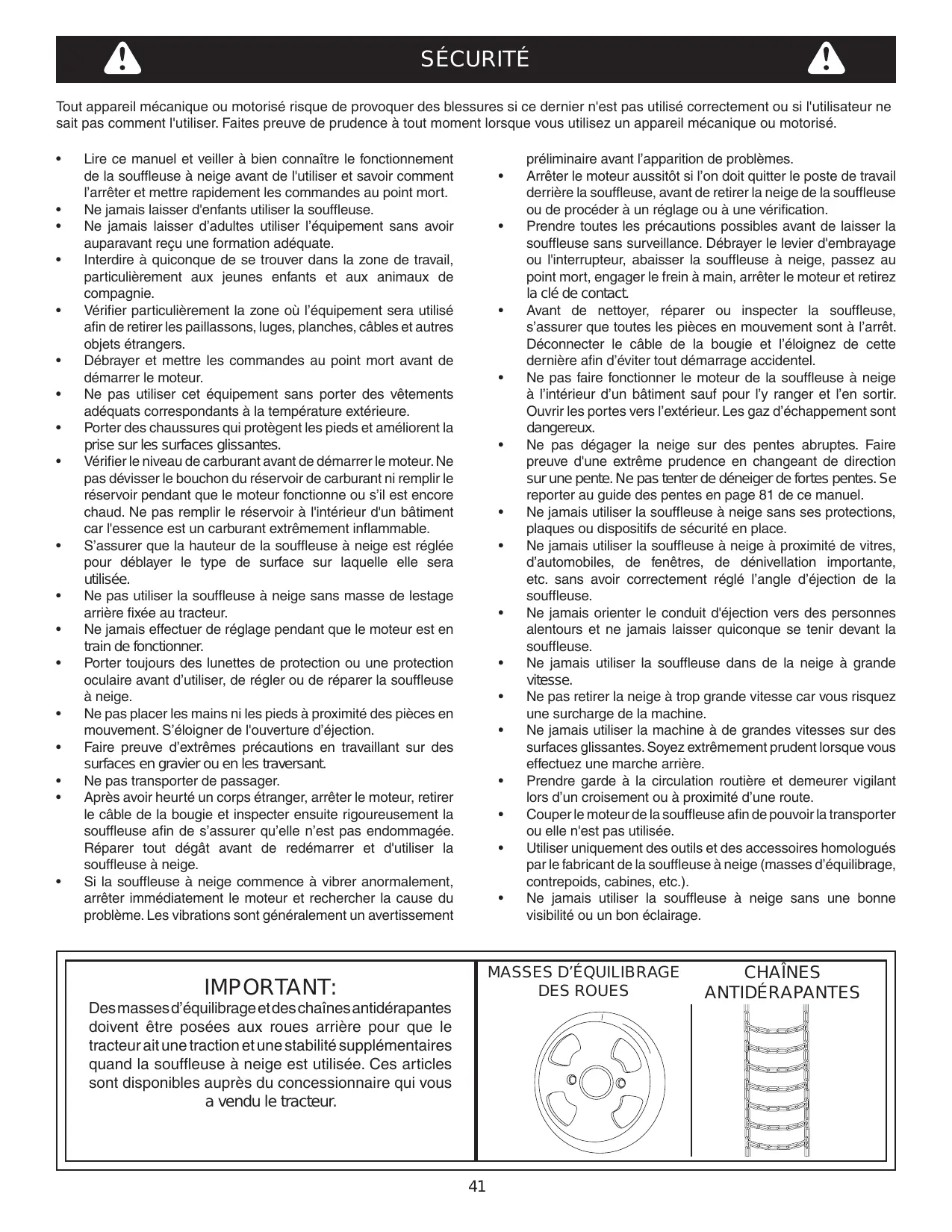 préliminaire avant l’apparition de problèmes. Arrêter le moteur aussitôt si l’on doit quitter le poste de travail derrière la souffleuse, avant de retirer la neige de la souffleuse ou de procéder à un réglage ou à une vérification. Prendre toutes les précautions possibles avant de laisser la souffleuse sans surveillance. Débrayer le levier d'embrayage ou l'interrupteur, abaisser la souffleuse à neige, passez au point mort, engager le frein à main, arrêter le moteur et retirez la clé de contact. Avant de nettoyer, réparer ou inspecter la souffleuse, s’assurer que toutes les pièces en mouvement sont à l’arrêt. Déconnecter le câble de la bougie et l’éloignez de cette dernière afin d’éviter tout démarrage accidentel. Ne pas faire fonctionner le moteur de la souffleuse à neige à l’intérieur d’un bâtiment sauf pour l’y ranger et l’en sortir. Ouvrir les portes vers l’extérieur. Les gaz d’échappement sont dangereux. Ne pas dégager la neige sur des pentes abruptes. Faire preuve d'une extrême prudence en changeant de direction sur une pente. Ne pas tenter de déneiger de fortes pentes. Se reporter au guide des pentes en page 81 de ce manuel. Ne jamais utiliser la souffleuse à neige sans ses protections, plaques ou dispositifs de sécurité en place. Ne jamais utiliser la souffleuse à neige à proximité de vitres, d’automobiles, de fenêtres, de dénivellation importante, etc. sans avoir correctement réglé l’angle d’éjection de la souffleuse. Ne jamais orienter le conduit d'éjection vers des personnes alentours et ne jamais laisser quiconque se tenir devant la souffleuse. Ne jamais utiliser la souffleuse dans de la neige à grande vitesse. Ne pas retirer la neige à trop grande vitesse car vous risquez une surcharge de la machine. Ne jamais utiliser la machine à de grandes vitesses sur des surfaces glissantes. Soyez extrêmement prudent lorsque vous effectuez une marche arrière. Prendre garde à la circulation routière et demeurer vigilant lors d’un croisement ou à proximité d’une route. Couper le moteur de la souffleuse afin de pouvoir la transporter ou elle n'est pas utilisée. Utiliser uniquement des outils et des accessoires homologués par le fabricant de la souffleuse à neige (masses d’équilibrage, contrepoids, cabines, etc.). Ne jamais utiliser la souffleuse à neige sans une bonne visibilité ou un bon éclairage. Des masses d’équilibrage et des chaînes antidérapantes doivent être posées aux roues arrière pour que le tracteur ait une traction et une stabilité supplémentaires quand la souffleuse à neige est utilisée. Ces articles sont disponibles auprès du concessionnaire qui vous a vendu le tracteur.