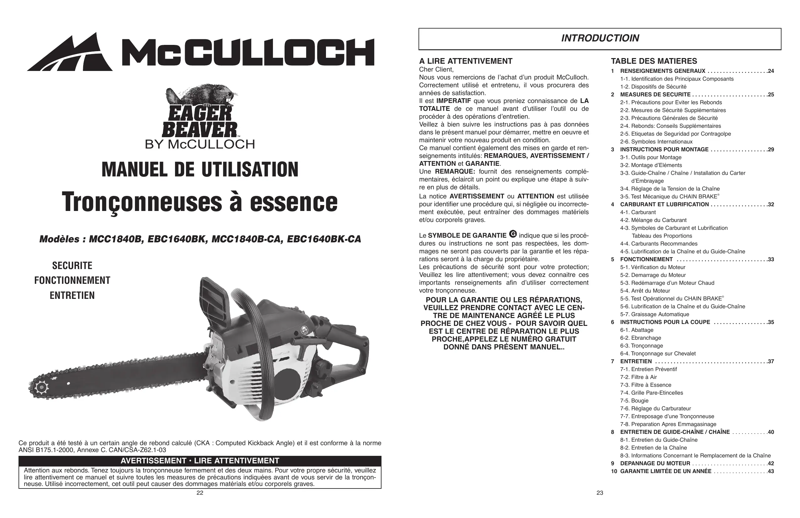 MODE D'EMPLOI MCC1840BK-CA MCCULLOCH