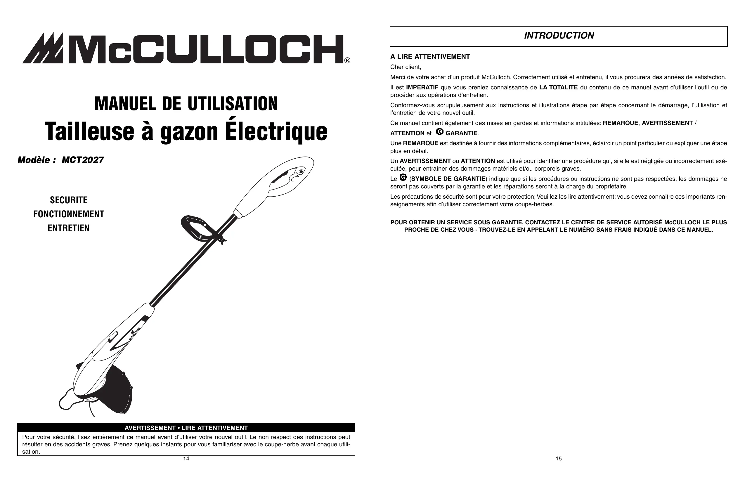 Merci de votre achat d'un produit McCulloch. Correctement utilisé et entretenu, il vous procurera des années de satisfaction.