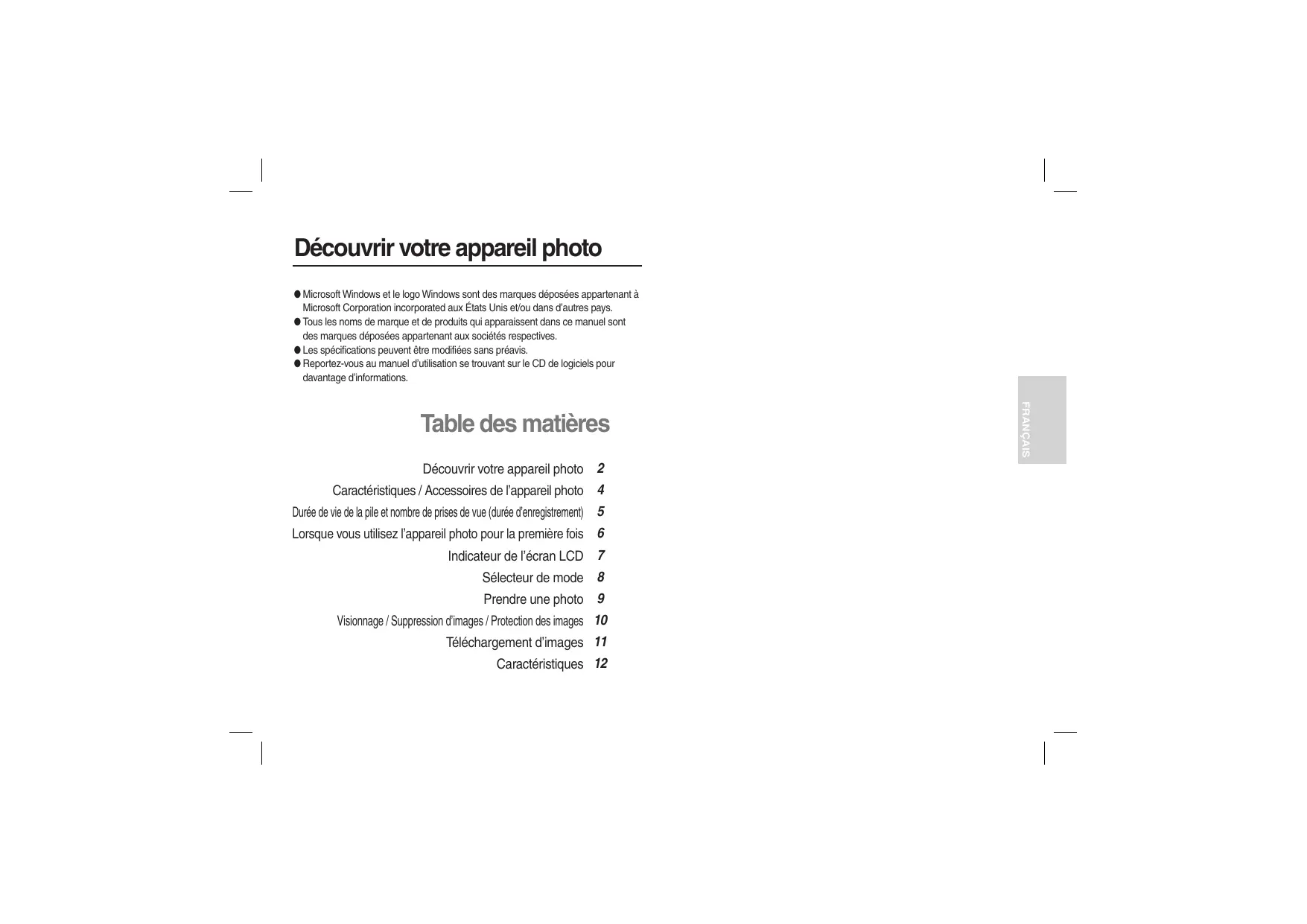Découvrir votre appareil photo ‘ Microsoft Windows et le logo Windows sont des marques déposées appartenant à Microsoft Corporation incorporated aux États Unis et/ou dans d'autres pays. ‘@ Tous les noms de marque et de produits qui apparaissent dans ce manuel sont des marques déposées appartenant aux sociétés respectives. Les spécifications peuvent être modifiées sans préavis. ‘© Reportez-vous au manuel d'utlsation se trouvant sur le CD de logiciels pour davantage d'informations. Table des matières Découvrir votre appareil photo 2 Caractéristiques / Accessoires de l'appareil photo 4 Durée de vie de la pile et nombre de prises de vue (durée d'enregistrement) 5 Lorsque vous utilisez l'appareil photo pour la première fois 6 Indicateur de l'écran LCD 7 Sélecteur de mode 8 Prendre une photo 9 Visionnage / Suppression d'images / Protection des images 10 Téléchargement d'images 11 Caractéristiques 12