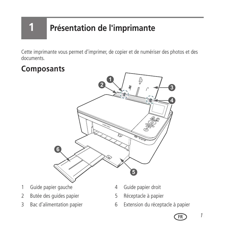 Présentation de l'imprimante Cette imprimante vous permet d’imprimer, de copier et de numériser des photos et des documents. Composants