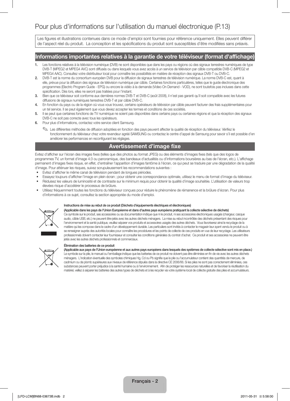 Evitez d'afficher sur l'écran des images fixes (telles que des photos au format JPEG) ou des éléments d'images fixes (tels que des logos de programmes TV, un format d'image 4:3 ou panoramique, des bandeaux d'actualités ou d'informations boursières au bas de l'écran, etc.). L'affichage permanent d'images fixes risque, en effet, d'entraîner l'apparition d'images fantôme à l'écran, ce qui peut se traduire par une dégradation de la qualité d'image. Pour atténuer les risques, suivez scrupuleusement les recommandations suivantes : • Evitez d’afficher le même canal de télévision pendant de longues périodes. • Essayez toujours d’afficher l’image en plein écran ; pour obtenir une correspondance optimale, utilisez le menu de format d’image du téléviseur. • Réduisez les valeurs de luminosité et de contraste sur le minimum requis pour obtenir la qualité d’image souhaitée. L’utilisation de valeurs trop élevées risque d’accélérer le processus de brûlure. • Utilisez fréquemment toutes les fonctions du téléviseur conçues pour réduire le phénomène de rémanence et la brûlure d’écran. Pour plus d’informations à ce sujet, consultez la section appropriée du mode d’emploi. Instructions de mise au rebut de ce produit (Déchets d'équipements électriques et électroniques) (Applicable dans les pays de l'Union Européenne et dans d'autres pays européens pratiquant la collecte sélective de déchets) Ce symbole sur le produit, ses accessoires ou sa documentation indique que ni le produit, ni ses accessoires électroniques usagés (chargeur, casque audio, câble USB, etc.) ne peuvent être jetés avec les autres déchets ménagers. La mise au rebut incontrôlée des déchets présentant des risques pour l'environnement et la santé publique, veuillez séparer vos produits et accessoires usagés des autres déchets. Vous favoriserez ainsi le recyclage de la matière qui les compose dans le cadre d'un développement durable. Les particuliers sont invités à contacter le magasin leur ayant vendu le produit ou à se renseigner auprès des autorités locales pour connaître les procédures et les points de collecte de ces produits en vue de leur recyclage. Les utilisateurs professionnels doivent contacter leur fournisseur et consulter les conditions générales du contrat d'achat. Ce produit et ses accessoires ne peuvent être jetés avec les autres déchets professionnels et commerciaux. Élimination des batteries de ce produit (Applicable aux pays de l'Union européenne et aux autres pays européens dans lesquels des systèmes de collecte sélective sont mis en place.) Le symbole sur la pile, le manuel ou l'emballage indique que les batteries de ce produit ne doivent pas être éliminées en fin de vie avec les autres déchets ménagers. L'indication éventuelle des symboles chimiques Hg, Cd ou Pb signifie que la pile ou l'accumulateur contient des quantités de mercure, de cadmium ou de plomb supérieures aux niveaux de référence stipulés dans la directive CE 2006/66. Si les piles ne sont pas correctement éliminées, ces substances peuvent porter préjudice à la santé humaine ou à l'environnement. Afin de protéger les ressources naturelles et de favoriser la réutilisation du matériel, veillez à séparer les batteries des autres types de déchets et à les recycler via votre système local de collecte gratuite des piles et accumulateurs.
