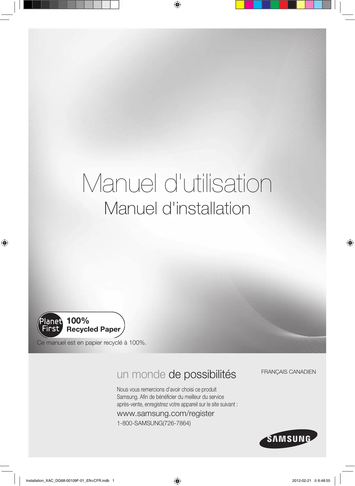 Manuel d'uUtllsation Manuel d'installation 100% | | moatten x4G-p66eavtosr ar evrorrine + Recycled Paper ten papier recyclé à 100%. un monde de possibilités Nous vous remercions d'avoir choisi ce produit Samsung. Afin de bénéficier du meilleur du service après-vente, enregistrez votre appareil sur le site suivant : Www.samsung.com/register 1-800-SAMSUNG(726-7864)