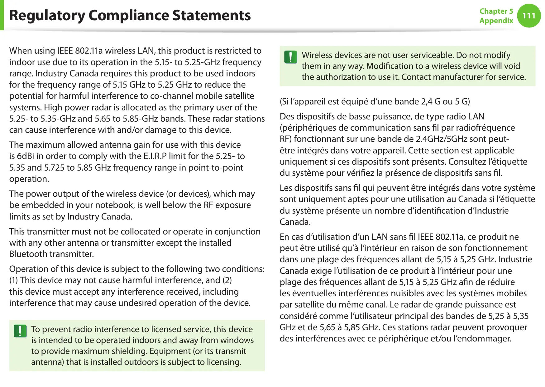 Regulatory Compliance Statements Le gain d’antenne maximum autorisé avec ce périphérique est de 6 dBi afin de respecter la limite de P.I.R.E. pour une plage des fréquences de 5,25 à 5,35 GHz et de 5,725 à 5,85 GHz dans un fonctionnement point à point. La sortie de puissance du dispositif sans fil (ou des dispositifs) qui peut être intégré dans votre système est bien inférieure aux limites d’exposition de RF établies par Industrie Canada. Ce transmetteur ne doit pas être colocalisé ni utilisé conjointement à tout autre transmetteur ou antenne, à l’exception du transmetteur Bluetooth installé. Son utilisation est soumise aux deux conditions suivantes : 1) ce dispositif ne peut pas provoquer d’interférences nuisibles et 2 2) ce dispositif doit accepter toute interférence reçue, y compris les interférences qui peuvent provoquer des anomalies dans le système.