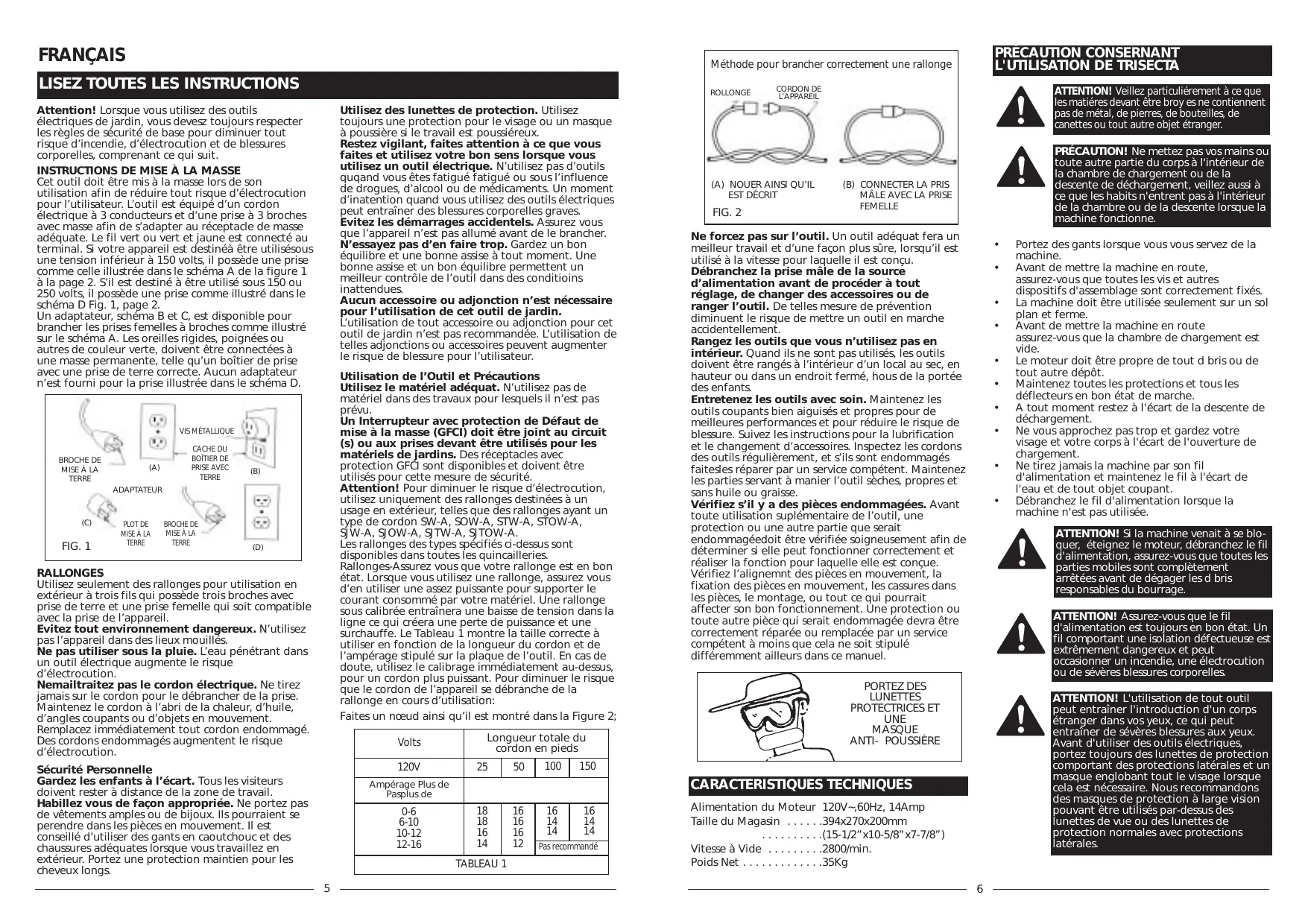 Cet outil doit être mis à la masse lors de son utilisation afin de réduire tout risque d’électrocution pour l’utilisateur. L’outil est équipé d’un cordon électrique à 3 conducteurs et d’une prise à 3 broches avec masse afin de s’adapter au réceptacle de masse adéquate. Le fil vert ou vert et jaune est connecté au terminal. Si votre appareil est destinéà être utilisésous une tension inférieur à 150 volts, il possède une prise comme celle illustrée dans le schéma A de la figure 1 à la page 2. S’il est destiné à être utilisé sous 150 ou 250 volts, il possède une prise comme illustré dans le schéma D Fig. 1, page 2. Un adaptateur, schéma B et C, est disponible pour brancher les prises femelles à broches comme illustré sur le schéma A. Les oreilles rigides, poignées ou autres de couleur verte, doivent être connectées à une masse permanente, telle qu’un boîtier de prise avec une prise de terre correcte. Aucun adaptateur n’est fourni pour la prise illustrée dans le schéma D. Utilisez des lunettes de protection. Utilisez toujours une protection pour le visage ou un masque à poussière si le travail est poussiéreux. Restez vigilant, faites attention à ce que vous faites et utilisez votre bon sens lorsque vous utilisez un outil électrique. N’utilisez pas d’outils quqand vous êtes fatigué fatigué ou sous l’influence de drogues, d’alcool ou de médicaments. Un moment d’inatention quand vous utilisez des outils électriques peut entraîner des blessures corporelles graves. Evitez les démarrages accidentels. Assurez vous que l’appareil n’est pas allumé avant de le brancher. N’essayez pas d’en faire trop. Gardez un bon équilibre et une bonne assise à tout moment. Une bonne assise et un bon équilibre permettent un meilleur contrôle de l’outil dans des conditioins inattendues. Aucun accessoire ou adjonction n’est nécessaire pour l’utilisation de cet outil de jardin. L’utilisation de tout accessoire ou adjonction pour cet outil de jardin n’est pas recommandée. L’utilisation de telles adjonctions ou accessoires peuvent augmenter le risque de blessure pour l’utilisateur. Utilisation de l’Outil et Précautions Utilisez le matériel adéquat. N’utilisez pas de matériel dans des travaux pour lesquels il n’est pas prévu. Un Interrupteur avec protection de Défaut de mise à la masse (GFCI) doit être joint au circuit (s) ou aux prises devant être utilisés pour les matériels de jardins. Des réceptacles avec protection GFCI sont disponibles et doivent être utilisés pour cette mesure de sécurité. Attention! Pour diminuer le risque d’électrocution, utilisez uniquement des rallonges destinées à un usage en extérieur, telles que des rallonges ayant un type de cordon SW-A, SOW-A, STW-A, STOW-A, SJW-A, SJOW-A, SJTW-A, SJTOW-A. Les rallonges des types spécifiés ci-dessus sont disponibles dans toutes les quincailleries. Rallonges-Assurez vous que votre rallonge est en bon état. Lorsque vous utilisez une rallonge, assurez vous d’en utiliser une assez puissante pour supporter le courant consommé par votre matériel. Une rallonge sous calibrée entraînera une baisse de tension dans la ligne ce qui créera une perte de puissance et une surchauffe. Le Tableau 1 montre la taille correcte à utiliser en fonction de la longueur du cordon et de l’ampérage stipulé sur la plaque de l’outil. En cas de doute, utilisez le calibrage immédiatement au-dessus, pour un cordon plus puissant. Pour diminuer le risque que le cordon de l’appareil se débranche de la rallonge en cours d’utilisation: Faites un nœud ainsi qu’il est montré dans la Figure 2;
