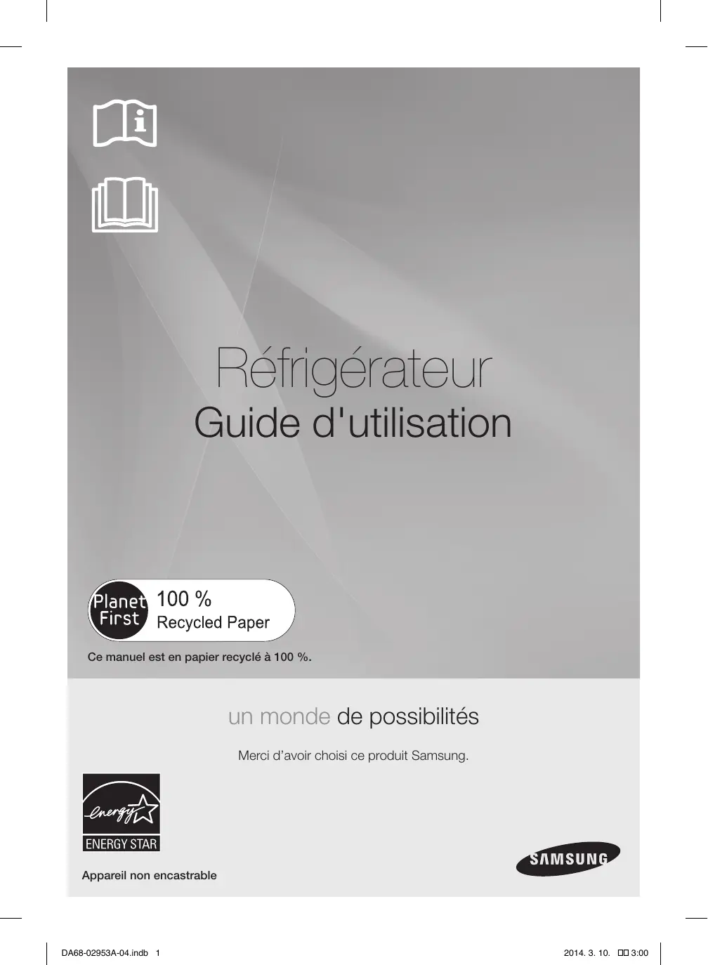 ATTENTION Avant d’utiliser votre nouveau réfrigérateur à portes françaises Samsung, veuillez lire attentivement ce manuel afin de vous assurer que vous savez comment utiliser de manière sûre et efficace ses différentes fonctionnalités. Cet appareil n’est pas conçu pour être utilisé par des personnes (y compris les enfants) inexpérimentées ou dont les capacités physiques, sensorielles ou mentales sont réduites, sauf si celles-ci sont sous la surveillance ou ont reçu les instructions d’utilisation appropriées de la personne responsable de leur sécurité. Les instructions suivantes concernent plusieurs modèles; il est donc possible que les caractéristiques de votre réfrigérateur soient légèrement différentes de celles spécifiées dans ce manuel. Pour toute question, contactez-nous au 1 800 SAMSUNG ou connectez-vous sur www.samsung.com. Pratiques inadaptées ou dangereuses susceptibles de causer des blessures légères ou des dommages matériels. À NE PAS faire. NE PAS démonter. NE PAS toucher. Suivre scrupuleusement les consignes. Débrancher de la prise murale. S'assurer que le réfrigérateur est relié à la terre afin d'éviter toute électrocution. Contacter le service d'assistance technique pour obtenir de l'aide. Consignes de sécurité importantes et symboles : AVERTISSEMENT Pratiques inadaptées ou dangereuses susceptibles de causer des blessures graves, voire mortelles. Remarque. Ces symboles d’avertissement ont pour but d’éviter tout risque de blessure. Respectez-les en toutes circonstances. Lisez attentivement la section Consignes de sécurité de ce manuel et conservez ce dernier en lieu sûr afin de pouvoir vous y reporter ultérieurement. Français - 2 DA68-02953A-04.indb 2 2014. 3. 10. 3:00