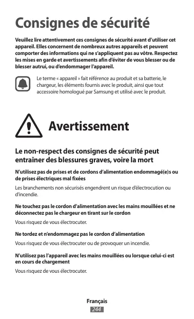 Le non-respect des consignes de sécurité peut entraîner des blessures graves, voire la mort N’utilisez pas de prises et de cordons d’alimentation endommagé(e)s ou de prises électriques mal fixées Les branchements non sécurisés engendrent un risque d’électrocution ou d’incendie. Ne touchez pas le cordon d’alimentation avec les mains mouillées et ne déconnectez pas le chargeur en tirant sur le cordon Vous risquez de vous électrocuter. Ne tordez et n’endommagez pas le cordon d’alimentation Vous risquez de vous électrocuter ou de provoquer un incendie. N’utilisez pas l’appareil avec les mains mouillées ou lorsque celui-ci est en cours de chargement Vous risquez de vous électrocuter.