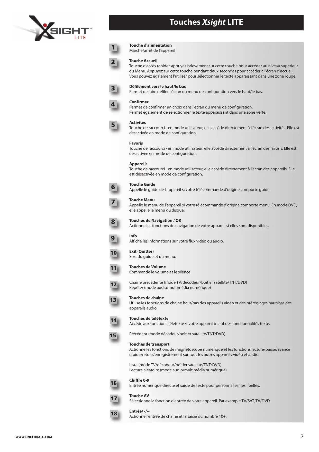 Les Xsight PLUS / Xsight LITE sont les toutes dernières télécommandes universelles haut de gamme de ONE FOR ALL. Elles vous offrent le contrôle complet de tous vos appareils audio et vidéo commandés par infrarouge, ainsi que des fonctionnalités haut de gamme telles que l'apprentissage et la commande d'activité. Vous pouvez configurer votre télécommande afin de commander vos appareils en suivant des instructions simples sur l'écran de la télécommande, ou la connecter à un PC pour ajouter des fonctions avancées tels que les activités et les favoris.