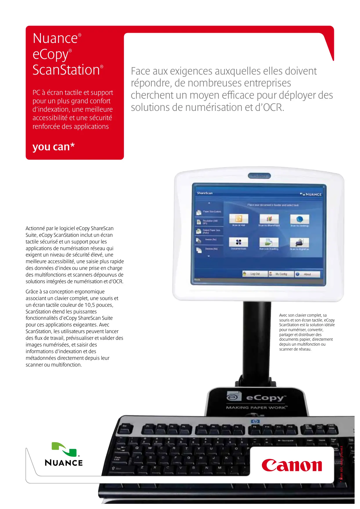 Grâce à sa conception ergonomique associant un clavier complet, une souris et un écran tactile couleur de 10,5 pouces, ScanStation étend les puissantes fonctionnalités d'eCopy ShareScan Suite
