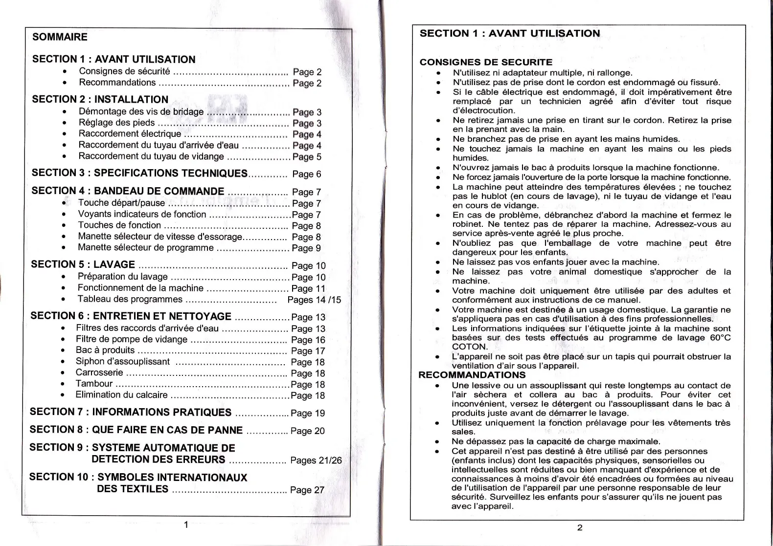,.,,,,..,,.,,,,. Page 3 ..,..,, Page 3 ,...........,. ,, Page 4 d'eau Page 4 vidange ,., Page 5 Démontage des vis de bridage Réglage des Raccordement électrique Raccordement du tuyau d'arrivée Raccordement du tuyau de pieds SEGTION 3 : SPECIFICATIONS TECHNIQUES...,.,,.,,... pase 6 COMMANDE .. pase 7 Touche départ/pause ..,,,,,,.,.;..,,^..... Page 7 Voyants indicateurs de fonction ^........Pa}e7 Touches de fonction ..... page I Manette sélecteur de vitesse d'essorage... page 8