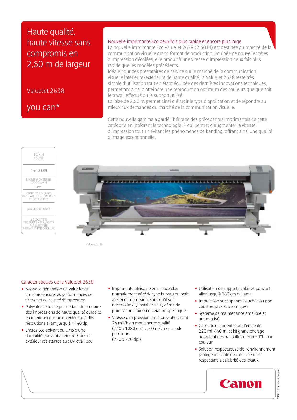 Haute qualité, haute vitesse sans compromis en 2,60 m de largeur ValueJet 2638 you can* Nouvelle imprimante Eco deux fois plus rapide et encore plus large. La nouvelle imprimante Eco ValueJet 2638 (2,60 M) est destinée au marché de la communication visuelle grand format de production. Equipée de nouvelles têtes d’impression décalées, elle produit à une vitesse d’impression deux fois plus rapide que les modèles précédents. Idéale pour des prestataires de service sur le marché de la communication visuelle intérieure/extérieure de haute qualité, la ValueJet 2638 reste très simple d’utilisation tout en étant équipée des dernières innovations techniques, permettant ainsi d’atteindre une reproduction optimum des couleurs quelque soit le travail effectué ou le support utilisé. La laize de 2,60 m permet ainsi d’élargir le type d’application et de répondre au mieux aux demandes du marché de la communication visuelle. Cette nouvelle gamme a gardé l’héritage des précédentes imprimantes de cette catégorie en intégrant la technologie I² qui permet d’augmenter la vitesse d’impression tout en évitant les phénomènes de banding, offrant ainsi une qualité d’image exceptionnelle. 102,3 pouces 1440 DPI encres pigmentées éco-solvant UMS Conçues pour des applications intérieures et extérieures logiciel RIP ONYX 2 blocs tête 180 Buses x 8 rangées par bloc tête 2 rangées par couleur ValueJet 2638 Caractéristiques de la ValueJet 2638 améliore encore les performances de vitesse et de qualité d’impression