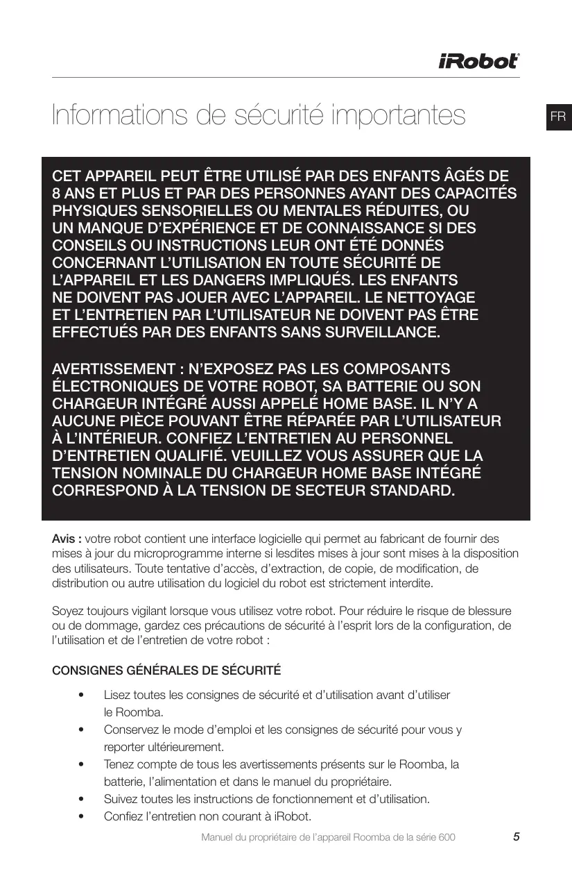 ÉLECTRONIQUES DE VOTRE ROBOT, SA BATTERIE OU SON CHARGEUR INTÉGRÉ AUSSI APPELÉ HOME BASE. IL N’Y A AUCUNE PIÈCE POUVANT ÊTRE RÉPARÉE PAR L’UTILISATEUR À L’INTÉRIEUR. CONFIEZ L’ENTRETIEN AU PERSONNEL D’ENTRETIEN QUALIFIÉ. VEUILLEZ VOUS ASSURER QUE LA TENSION NOMINALE DU CHARGEUR HOME BASE INTÉGRÉ CORRESPOND À LA TENSION DE SECTEUR STANDARD. Avis : votre robot contient une interface logicielle qui permet au fabricant de fournir des mises à jour du microprogramme interne si lesdites mises à jour sont mises à la disposition des utilisateurs. Toute tentative d’accès, d’extraction, de copie, de modification, de distribution ou autre utilisation du logiciel du robot est strictement interdite. Soyez toujours vigilant lorsque vous utilisez votre robot. Pour réduire le risque de blessure ou de dommage, gardez ces précautions de sécurité à l’esprit lors de la configuration, de l’utilisation et de l’entretien de votre robot : CONSIGNES GÉNÉRALES DE SÉCURITÉ • Lisez toutes les consignes de sécurité et d’utilisation avant d’utiliser le Roomba. • Conservez le mode d’emploi et les consignes de sécurité pour vous y reporter ultérieurement. • Tenez compte de tous les avertissements présents sur le Roomba, la batterie, l’alimentation et dans le manuel du propriétaire. • Suivez toutes les instructions de fonctionnement et d’utilisation. • Confiez l’entretien non courant à iRobot. Manuel du propriétaire de l’appareil Roomba de la série 600