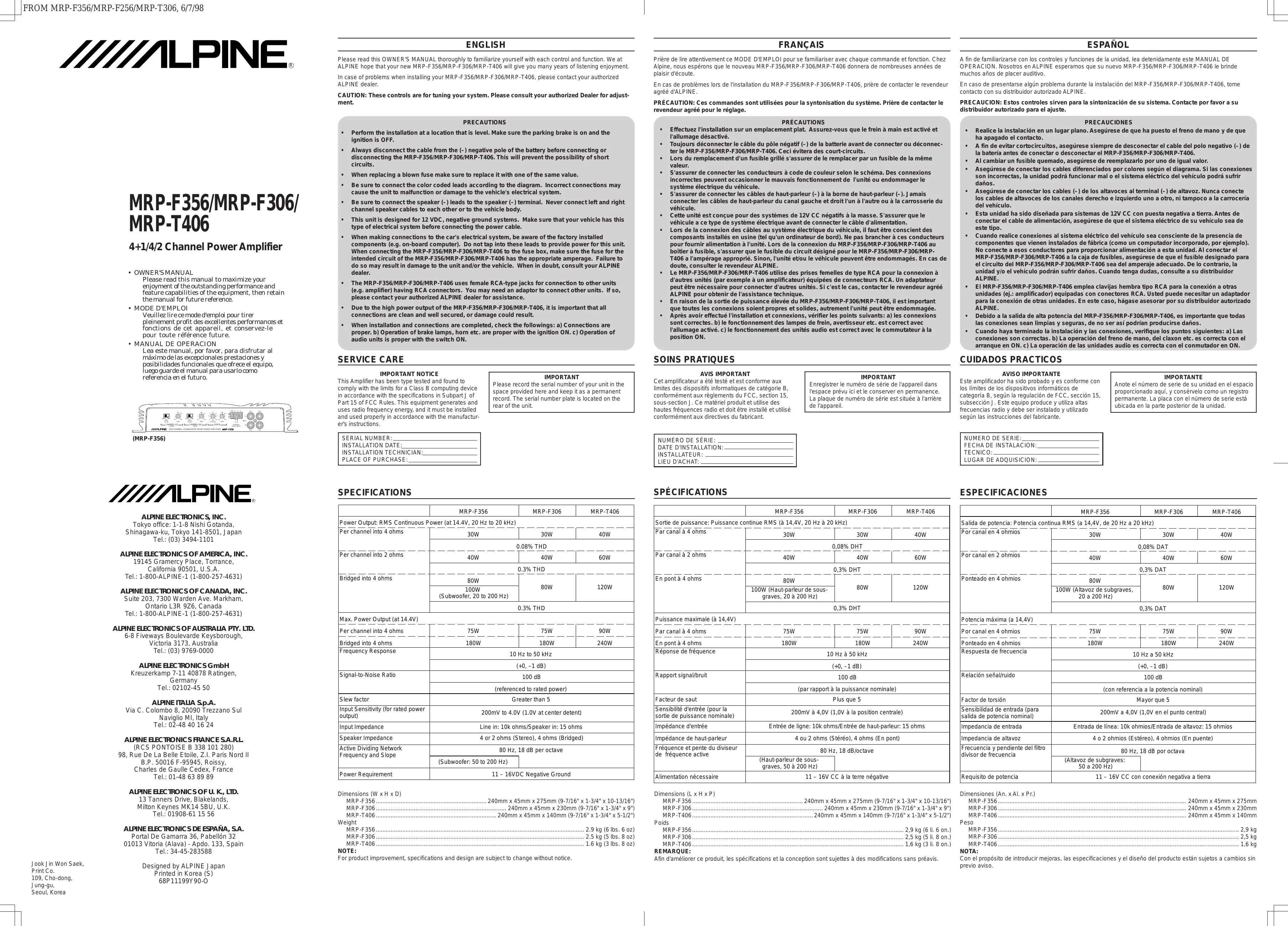 (sold separately). (Refer to the "Bridge Connections" below.) 6 Insulation Tube Use for POWER SUPPLY (BATTERY/REMOTE/ GND) and SPEAKER OUTPUT terminals. 7 Ground Lead (Black) Connect this lead securely to a clean, bare metal spot on the vehicle's chassis. Verify this point to be a true ground by checking for continuity between that point and the negative (-) terminal of the vehicle's battery. Ground all your audio components to the same point on the chassis to prevent ground loops. 8 Remote Turn-On Lead (Blue/White) Connect this lead to the remote turn-on or power antenna (positive trigger, (+) 12V only) lead of your head unit. 9 Battery Lead (Yellow) Be sure to add à 430 amp fuse as close as possible to the battery's positive (+) terminal. This fuse will protect your vehicle's electrical system in case of a short circuit. If you need to extend this lead, the wire gauge should be 8 AWG or larger. % MRP-F356 … 30 amp fuse MRP-F306 … 25 amp fuse MRP-T406 … 20 amp fuse - Speaker Level Input Connector These leads are input leads for use with head units not equipped with preamp outputs. When not using the RCA Line Input connectors, you should connect these wires to the speaker output leads of your head unit. The MRP-F356/ MRP-F306/MRP-T406 accepts input from high power or standard power head units a RCA InputJacks Connect these jacks to the line out leads on your head unit using RCA extension cables (sold separately). Be sure to observe correct channel connections; Left to Left and Right to Right. (Front to Front and Rear to Rear (except for MRP-T406)) b Pre-Out]J acks (MRP-F306 only) These jacks provide a Front +Rear summed output (Non-fading ). This is an ideal output for driving a separate subwoofer amp. This output is full-range, and is not affected by the crossover. c Speaker Input Leads These leads are input leads for use with head units not equipped with preamp outputs. Connect these wires to the speaker output leads of your head unit. The MRP-F356/MRP-F306/ MRP-T406 accepts input from high power or standard power head units d Front Left Speaker (White (+)) e Front Left Speaker (White/Black (-)) f Front Right Speaker (Gray (+)) g Front Right Speaker (Gray/Black (-)) h Rear Left Speaker (Green (+)) (except for MRP-T406) i Rear Left Speaker (Green/Black (-)) (except for MRP-T406) j Rear Right Speaker (Violet (+)) (except for MRP-T406) K Rear Right Speaker (Violet/Black (-)) (except for MRP-T406) Avant d'effectuer les connexions, vérifier que tous les composants audio sont hors tension. Connectez le conducteur jaune de la batterie provenant de l'amplificateur directement à la borne positive (+) de la batterie du véhicule. Ne pas le connecter au boîtier de fusibles. Pour éviter que des bruits extérieurs interfèrent avec le système audio. +_ Installez l'appareil et acheminez les câbles à au moins 10 cm de distance du faisceau de câbles de la voiture. + Éloignez les câbles d'alimentation de la batterie le plus possible des autres câbles. + _Raccordez bien le fil de terre à un point métallique apparent (enlevez la couche de peinture si nécessaire) du châssis de la voiture. + Si vous rajoutez un filtre antiparasites en option, raccordez-le le plus loin possible de l'appareil. Contactez votre revendeur Alpine pour plus de détails sur les divers filtres antiparasites Alpine disponibles. + _ Consultez votre revendeur Alpine pour plus de détails sur les mesures de prévention contre les parasites 5 Connecteur de sortie de haut-parleur Le MRP-F356/MRP-F306/MRP-T406 a deux ensembles de sorties haut-parleurs. Vérifier que les connexions et la mise en phase des sorties haut-parleurs sont correctes. En mode stéréo, connecter les sorties du haut-parleur droit sur le haut-parleur droit et les sorties de gauche sur le haut-parleur gauche. Connecter la sortie positive sur la borne positive du haut-parleur et la sortie négative sur la borne négative. En mode ponté, connecter la sortie positive gauche sur la borne positive du haut-parleur et la sortie négative droite sur la borne négative du haut-parleur. Ne pas utiliser les bornes haut- parleur (-) à la fois pour les canaux droit et gauche. Ne pas connecter ce câble sur le châssis du véhicule. REMARQUES: