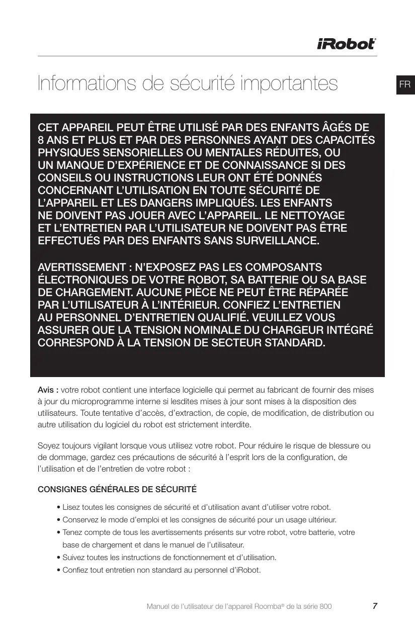 - Confiez tout entretien non standard au personnel d’iRobot. Manuel de l’utilisateur de l’appareil Roomba® de la série 800