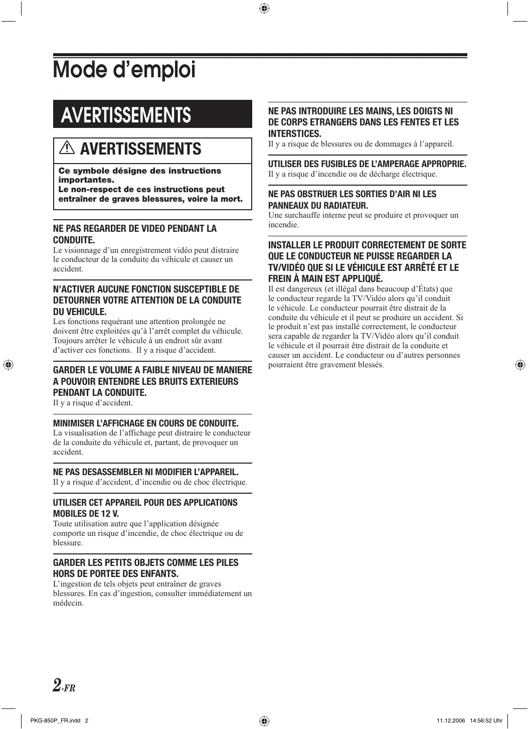MOBILES DE 12 V. Toute utilisation autre que l’application désignée comporte un risque d’incendie, de choc électrique ou de blessure. GARDER LES PETITS OBJETS COMME LES PILES HORS DE PORTEE DES ENFANTS. L’ingestion de tels objets peut entraîner de graves blessures. En cas d’ingestion, consulter immédiatement un médecin. 2-FR PKG-850P_FR.indd 2