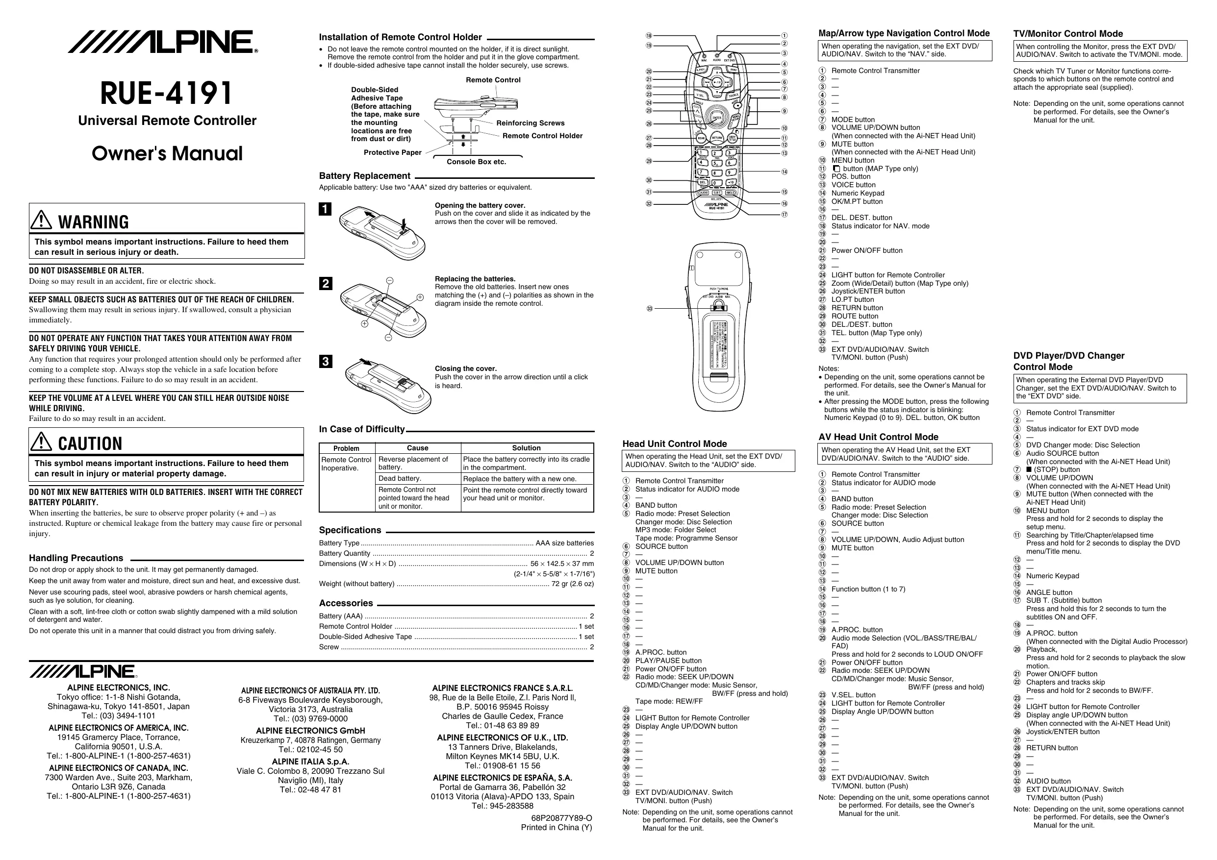 RUE-4191 - Télécommande universelle ALPINE - Notice d'utilisation et mode d'emploi gratuit