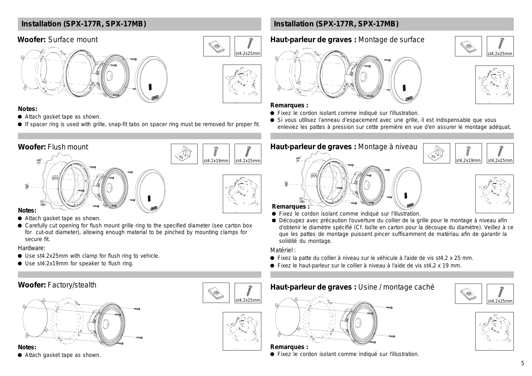 Fixez l'adaptateur sur le véhicule à l'aide de vis st4.2x25mm. Fixez le haut-parleur sur l'adaptateur (seulement un adaptateur) à l'aide de vis M4x10mm. Fixez le haut-parleur sur l'adaptateur (un adaptateur + un anneau d’espacement) à l'aide de vis M4x18mm. Installation (SPX-137R) Installation (SPX-137R) Haut-parleur de graves : Montage de surface Woofer: Surface mount st4.2x25mm Remarques : Notes: