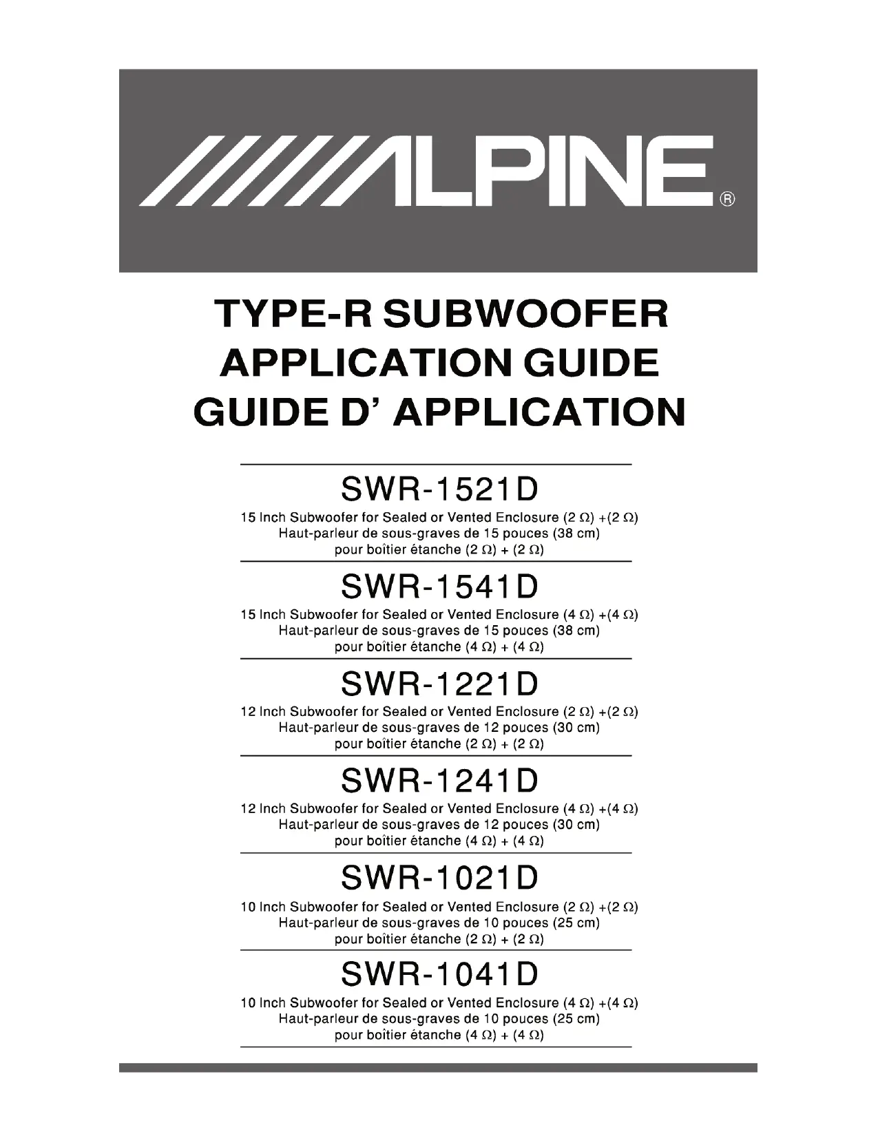 Téléchargez la notice de votre Subwoofer au format PDF gratuitement ! Retrouvez votre notice SWR-1241D - ALPINE et reprennez votre appareil électronique en main. Sur cette page sont publiés tous les documents nécessaires à l'utilisation de votre appareil SWR-1241D de la marque ALPINE.