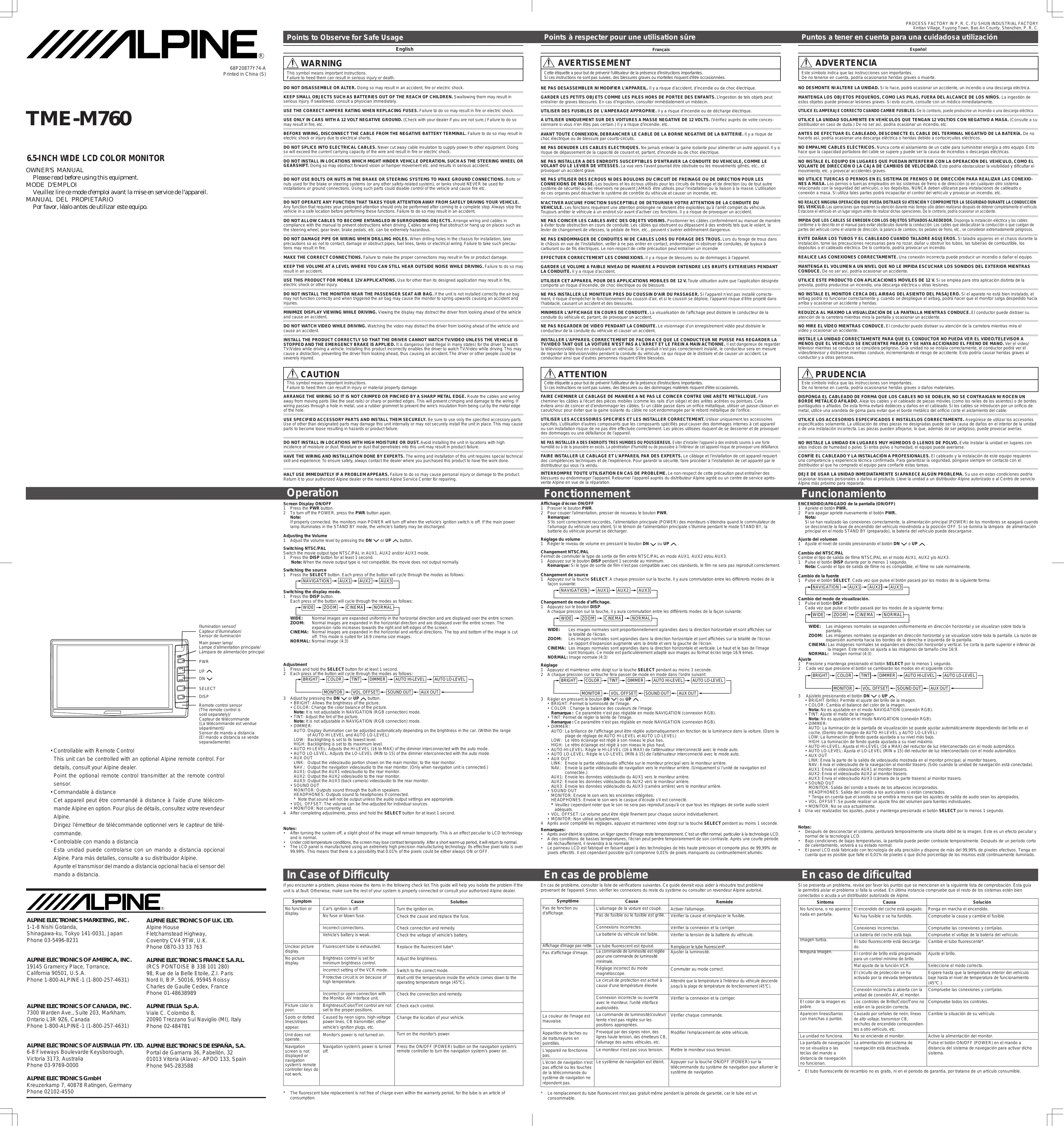 - Veuillez cependant noter que le son ne sera pas reproduit jusqu'à ce que tous les réglages de sortie audio soient adéquats. + VOL. OFFSET: Le volume peut être réglé finement pour chaque source individuellement. + MONITOR: Non utilisé actuellement 4 Après avoir complété les réglages, appuyez et maintenez votre doigt sur la touche SELECT pendant au moins 1 seconde. Remarques: +" Après avoir éteintle système, un léger spectre d'image reste temporairement C'estun effet normal, particulier à la technologie LCD. + A des conditions de basses températures, l'écran peut perdre temporairement de son contraste. Après une courte période dé réchauffement, il reviendra à la normale. + Le panneau LCD est fabriqué en faisant appel à des technologies de très haute précision et comporte plus de 99,99% de pixels effectifs. Il est cependant possible qu'il comprenne 0,01% de pixels manquants ou continuellement allumés En cas de problè En cas de problème, consulter la liste de vérifications suivantes. Ce guide devrait vous aider à résoudre tout problème provenant de l'appareil. Sinon, vérifier les connexions du reste du système ou consulter un revendeur Alpine autorisé. DISPONGA EL CABLEADO DE FORMA QUE LOS CABLES NO SE DOBLEN, NO SE CONTRAIGAN NI ROCEN UN BORDE METALICO AFILADO. Aleje los cables y el cableado de piezas môviles (como los railes de los asientos) o de bordes puntiagudos o afllados. De esta forma evitaré dobleces y daños en el cableado. Si los cables se introducen por un orificio de metal, utlice una arandela de goma para evitar que el borde metélico del orificio corte el aislamiento del cable. UTILICE LOS ACCESORIOS ESPECIFICADOS E INSTÂLELOS CORRECTAMENTE. Asegirese de utlizar los accesorios especificados solamente. La utillzaciôn de otras piezas no designadas puede ser la causa de daños en el interior de la unidad 0 de una instalaciôn incorrecta. Las piezas pueden aflojarse, lo que, ademés de ser peligroso, puede provocar averias. NO INSTALE LA UNIDAD EN LUGARES MUY HÜMEDOS O LLENOS DE POLVO. Evite instalar la unidad en lugares con altos indices de humedad o polvo. Si entra polvo o humedad, el equipo puede averiarse. CONFIE EL CABLEADO Y LA INSTALACIÔN À PROFESIONALES. El cableado y la instalaciôn de este equipo requieren una competencia y experiencia técnica confirmada. Para garantizar la seguridad, péngase siempre en contacto con el distibuidor al que ha comprado el equipo para confiarle estas tareas DEJE DE USAR LA UNIDAD INMEDIATAMENTE SI APARECE ALGÜN PROBLEMA. Su uso en estas condiciones podria ocasionar lesiones personales o daños al producto. Lieve la unidad a un distribuidor Alpine autorizado o al Centro de servicio Alpine més préximo para repararla ENCENDIDO/APAGADO de la pantalla (ON/OFF) 1 Apriete el botôn PWR. 2 Para apagar apriete nuevamente el botén PWR. Nota: Si se han realizado las conexiones correctamente, la alimentaciôn principal (POWER) de los monitores se apagaré cuando se desconecte la llave de encendido del vehiculo moviéndola a la posiciôn OFF. Sise ilumina la lémpara de almentaciôn principal en el modo STAND BY (preparado), la bateria del vehiculo puede descargarse Ajuste del volumen 1° Ajuste el nivel de sonido presionando el botôn DN Vo UP À. Cambio del NTSC/PAL Cambie el tipo de salida de flme NTSC/PAL en el modo AUX1, AUX2 y/o AUX3 1 Pulse el botén DISP durante por lo menos 1 segundo. Nota: Cuando el tipo de salida de filme no es compatible, el filme no sale normalmente. Cambio de la fuente 1° Pulse el botén SELECT. Cada vez que pulse el botôn pasaré por los modos de la siguiente forma: pfAsaTon 1 ame au Cambio del modo de visualizaciôn, 1° Pulse el botôn DISP. Cada vez que pulse el botén pasaré por los modos de la siguiente forma: pe (room [ce] ms WIDE: Las imâgenes normales se expanden unifomemente en direcciôn horizontal ÿ se visualizan sobre toda la pantalla. Z00M: Las imâgenes normales se expanden en direcciôn horizontal y se visualizan sobre toda la pantalla. La razôn de expansiôn aumenta hacia los bordes de la derecha e izquierda de la pantalla CINEMA: Las imégenes normales se expanden en direcciôn horizontal y vertical. Se corta la parte superior e inferior de la imagen. Este modo se ajusta à las imégenes de tamaño cine 16:9. NORMAL: Imagen normal (4:3) Ajuste 1° Presione y mantenga presionado el botén SELECT por lo menos 1 segundo.