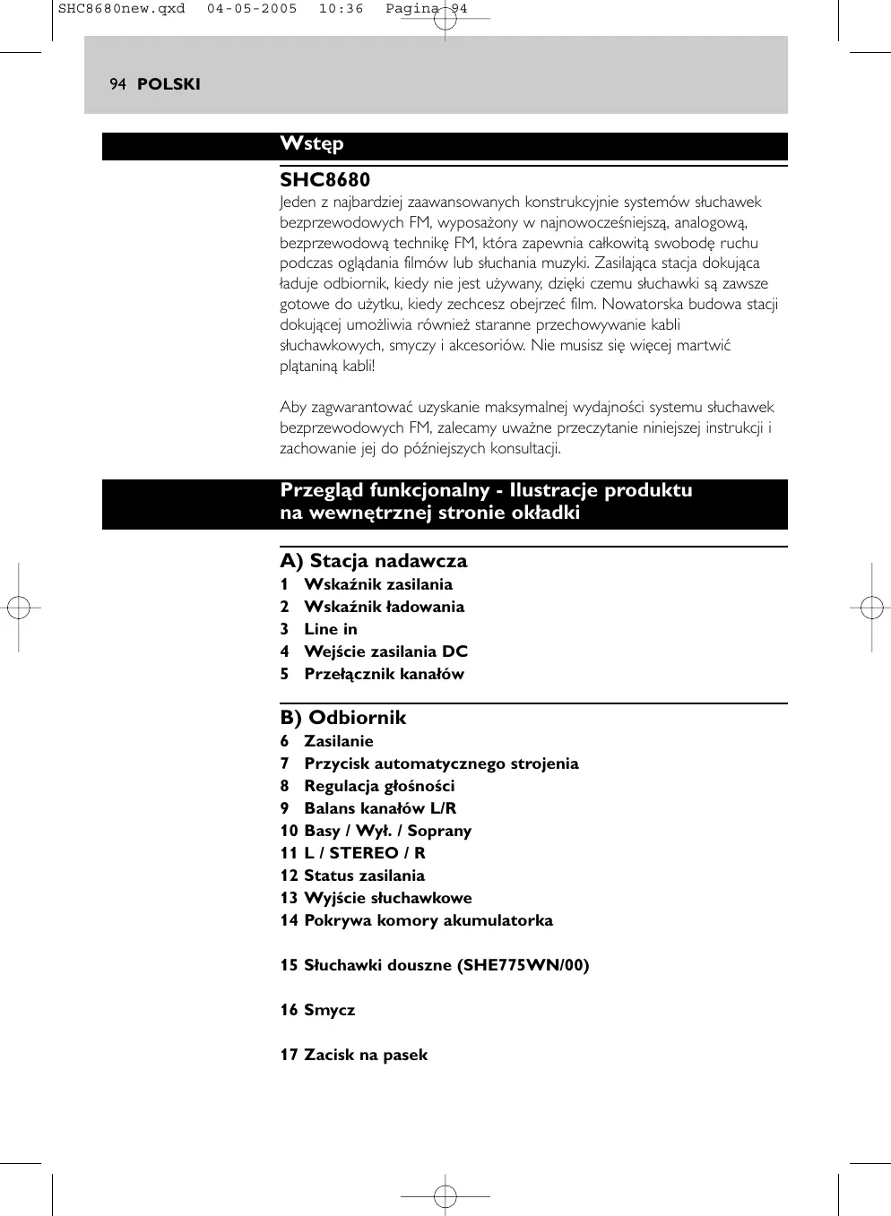 Turk Philips Tic. A.S. Y. Dudullu Org. San Bolg.2.Cad.No:22 Umraniye-IST-Turkiye SHC8680new.qxd 04-05-2005 10:36 Pagina 94 94 POLSKI Wstęp SHC8680 Jeden z najbardziej zaawansowanych konstrukcyjnie systemów słuchawek bezprzewodowych FM, wyposażony w najnowocześniejszą, analogową, bezprzewodową technikę FM, która zapewnia całkowitą swobodę ruchu podczas oglądania filmów lub słuchania muzyki. Zasilająca stacja dokująca ładuje odbiornik, kiedy nie jest używany, dzięki czemu słuchawki są zawsze gotowe do użytku, kiedy zechcesz obejrzeć film. Nowatorska budowa stacji dokującej umożliwia również staranne przechowywanie kabli słuchawkowych, smyczy i akcesoriów. Nie musisz się więcej martwić plątaniną kabli! Aby zagwarantować uzyskanie maksymalnej wydajności systemu słuchawek bezprzewodowych FM, zalecamy uważne przeczytanie niniejszej instrukcji i zachowanie jej do późniejszych konsultacji. Przegląd funkcjonalny - Ilustracje produktu na wewnętrznej stronie okładki A) Stacja nadawcza