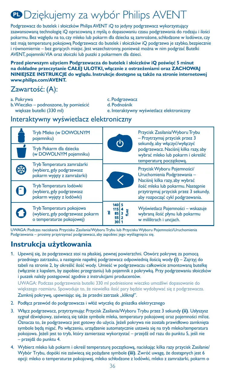 Dziękujemy za wybór Philips AVENT Podgrzewacz do butelek i słoiczków Philips AVENT iQ to jedyny podgrzewacz wykorzystujący zaawansowaną technologię iQ opracowaną z myślą o dopasowaniu czasu podgrzewania do rodzaju i ilości pokarmu. Bez względu na to, czy mleko lub pokarm dla dziecka są zamrożone, schłodzone w lodówce, czy też mają temperaturę pokojową Podgrzewacz do butelek i słoiczków iQ podgrzewa je szybko, bezpiecznie i równomiernie – bez gorących miejsc. Jest wszechstronny, ponieważ można w nim podgrzać Butelki AVENT, pojemniki VIA oraz słoiczki lub puszki z pokarmem dla dzieci. Przed pierwszym użyciem Podgrzewacza do butelek i słoiczków iQ poświęć 5 minut na dokładne przeczytanie CAŁEJ ULOTKI, włącznie z ostrzeżeniami oraz ZACHOWAJ NINIEJSZE INSTRUKCJE do wglądu. Instrukcje dostępne są także na stronie internetowej www.philips.com/AVENT. Zawartość: (A): a. Pokrywa b. Wieczko – podnoszone, by pomieścić większe butelki (330 ml) c. Podgrzewacz d. Podnośnik e. Interaktywny wyświetlacz elektroniczny Interaktywny wyświetlacz elektroniczny Przycisk Zasilania/Wyboru Trybu – Przytrzymaj przycisk przez 3 sekundy, aby włączyć/wyłączyć podgrzewacz. Naciśnij kilka razy, aby wybrać mleko lub pokarm i określić temperaturę początkową. Tryb Mleko (w DOWOLNYM pojemniku) Tryb Pokarm dla dziecka (w DOWOLNYM pojemniku) Tryb Temperatura pokojowa (wybierz, gdy podgrzewasz pokarm o temperaturze pokojowej)