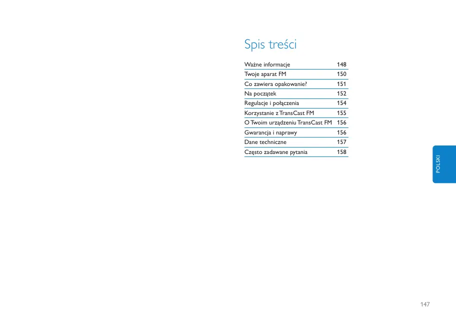Aby zachowa wazność gwarancji nigdy nie robuj naprawiec aparatu na wasna reke. W przypadku klopotów z uzywaniem przy skontatkowianie są z firma Philipsomyre przyczycyć poniszcie czesto zadawane pytania. jejli problem nie zostanie rozwiazny, prosimy skorzysta z wirtryny www.philips.com/welcome. Kiedy bedziez kontaktalkoś z firma Philips, upewnij sie, ze TransCast FM jest pod rekaj z masz(Number modelu i seri.