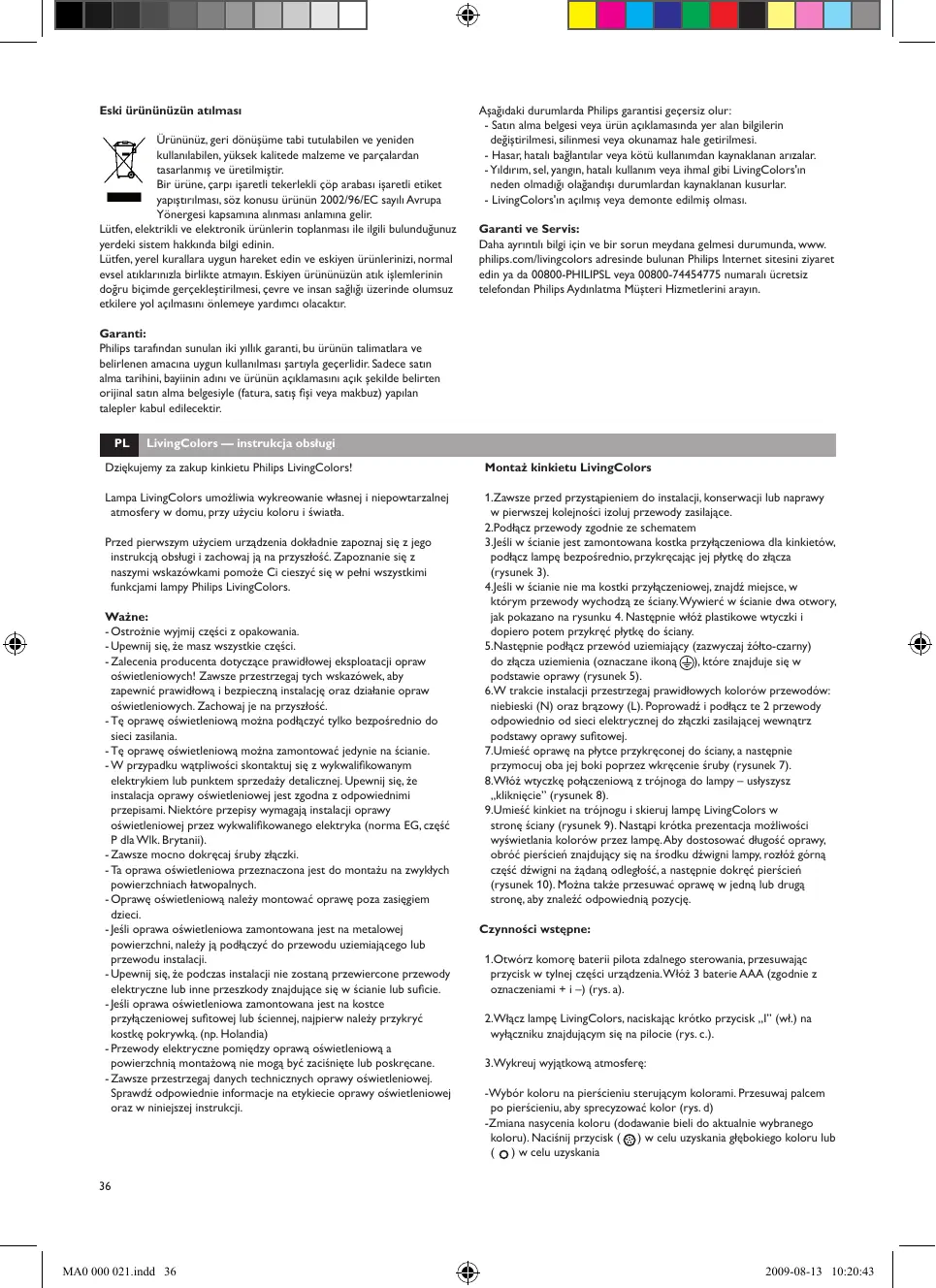 LivingColors — instrukcja obsługi Dziękujemy za zakup kinkietu Philips LivingColors! Montaż kinkietu LivingColors Lampa LivingColors umożliwia wykreowanie własnej i niepowtarzalnej atmosfery w domu, przy użyciu koloru i światła. 1.Zawsze przed przystąpieniem do instalacji, konserwacji lub naprawy w pierwszej kolejności izoluj przewody zasilające. 2.Podłącz przewody zgodnie ze schematem 3.Jeśli w ścianie jest zamontowana kostka przyłączeniowa dla kinkietów, podłącz lampę bezpośrednio, przykręcając jej płytkę do złącza (rysunek 3). 4.Jeśli w ścianie nie ma kostki przyłączeniowej, znajdź miejsce, w którym przewody wychodzą ze ściany. Wywierć w ścianie dwa otwory, jak pokazano na rysunku 4. Następnie włóż plastikowe wtyczki i dopiero potem przykręć płytkę do ściany. 5.Następnie podłącz przewód uziemiający (zazwyczaj żółto-czarny) do złącza uziemienia (oznaczane ikoną ), które znajduje się w podstawie oprawy (rysunek 5). 6.W trakcie instalacji przestrzegaj prawidłowych kolorów przewodów: niebieski (N) oraz brązowy (L). Poprowadź i podłącz te 2 przewody odpowiednio od sieci elektrycznej do złączki zasilającej wewnątrz podstawy oprawy sufitowej. 7.Umieść oprawę na płytce przykręconej do ściany, a następnie przymocuj oba jej boki poprzez wkręcenie śruby (rysunek 7). 8.Włóż wtyczkę połączeniową z trójnoga do lampy – usłyszysz „kliknięcie” (rysunek 8). 9.Umieść kinkiet na trójnogu i skieruj lampę LivingColors w stronę ściany (rysunek 9). Nastąpi krótka prezentacja możliwości wyświetlania kolorów przez lampę. Aby dostosować długość oprawy, obróć pierścień znajdujący się na środku dźwigni lampy, rozłóż górną część dźwigni na żądaną odległość, a następnie dokręć pierścień (rysunek 10). Można także przesuwać oprawę w jedną lub drugą stronę, aby znaleźć odpowiednią pozycję. Przed pierwszym użyciem urządzenia dokładnie zapoznaj się z jego instrukcją obsługi i zachowaj ją na przyszłość. Zapoznanie się z naszymi wskazówkami pomoże Ci cieszyć się w pełni wszystkimi funkcjami lampy Philips LivingColors. Ważne: - Ostrożnie wyjmij części z opakowania. - Upewnij się, że masz wszystkie części. - Zalecenia producenta dotyczące prawidłowej eksploatacji opraw oświetleniowych! Zawsze przestrzegaj tych wskazówek, aby zapewnić prawidłową i bezpieczną instalację oraz działanie opraw oświetleniowych. Zachowaj je na przyszłość. - Tę oprawę oświetleniową można podłączyć tylko bezpośrednio do sieci zasilania. - Tę oprawę oświetleniową można zamontować jedynie na ścianie. - W przypadku wątpliwości skontaktuj się z wykwalifikowanym elektrykiem lub punktem sprzedaży detalicznej. Upewnij się, że instalacja oprawy oświetleniowej jest zgodna z odpowiednimi przepisami. Niektóre przepisy wymagają instalacji oprawy oświetleniowej przez wykwalifikowanego elektryka (norma EG, część P dla Wlk. Brytanii). - Zawsze mocno dokręcaj śruby złączki. - Ta oprawa oświetleniowa przeznaczona jest do montażu na zwykłych powierzchniach łatwopalnych. - Oprawę oświetleniową należy montować oprawę poza zasięgiem dzieci. - Jeśli oprawa oświetleniowa zamontowana jest na metalowej powierzchni, należy ją podłączyć do przewodu uziemiającego lub przewodu instalacji. - Upewnij się, że podczas instalacji nie zostaną przewiercone przewody elektryczne lub inne przeszkody znajdujące się w ścianie lub suficie. - Jeśli oprawa oświetleniowa zamontowana jest na kostce przyłączeniowej sufitowej lub ściennej, najpierw należy przykryć kostkę pokrywką. (np. Holandia) - Przewody elektryczne pomiędzy oprawą oświetleniową a powierzchnią montażową nie mogą być zaciśnięte lub poskręcane. - Zawsze przestrzegaj danych technicznych oprawy oświetleniowej. Sprawdź odpowiednie informacje na etykiecie oprawy oświetleniowej oraz w niniejszej instrukcji. Czynności wstępne: 1.Otwórz komorę baterii pilota zdalnego sterowania, przesuwając przycisk w tylnej części urządzenia. Włóż 3 baterie AAA (zgodnie z oznaczeniami + i –) (rys. a). 2.Włącz lampę LivingColors, naciskając krótko przycisk „I” (wł.) na wyłączniku znajdującym się na pilocie (rys. c.). 3.Wykreuj wyjątkową atmosferę: -Wybór koloru na pierścieniu sterującym kolorami. Przesuwaj palcem po pierścieniu, aby sprecyzować kolor (rys. d) -Zmiana nasycenia koloru (dodawanie bieli do aktualnie wybranego koloru). Naciśnij przycisk ( ) w celu uzyskania głębokiego koloru lub ( ) w celu uzyskania