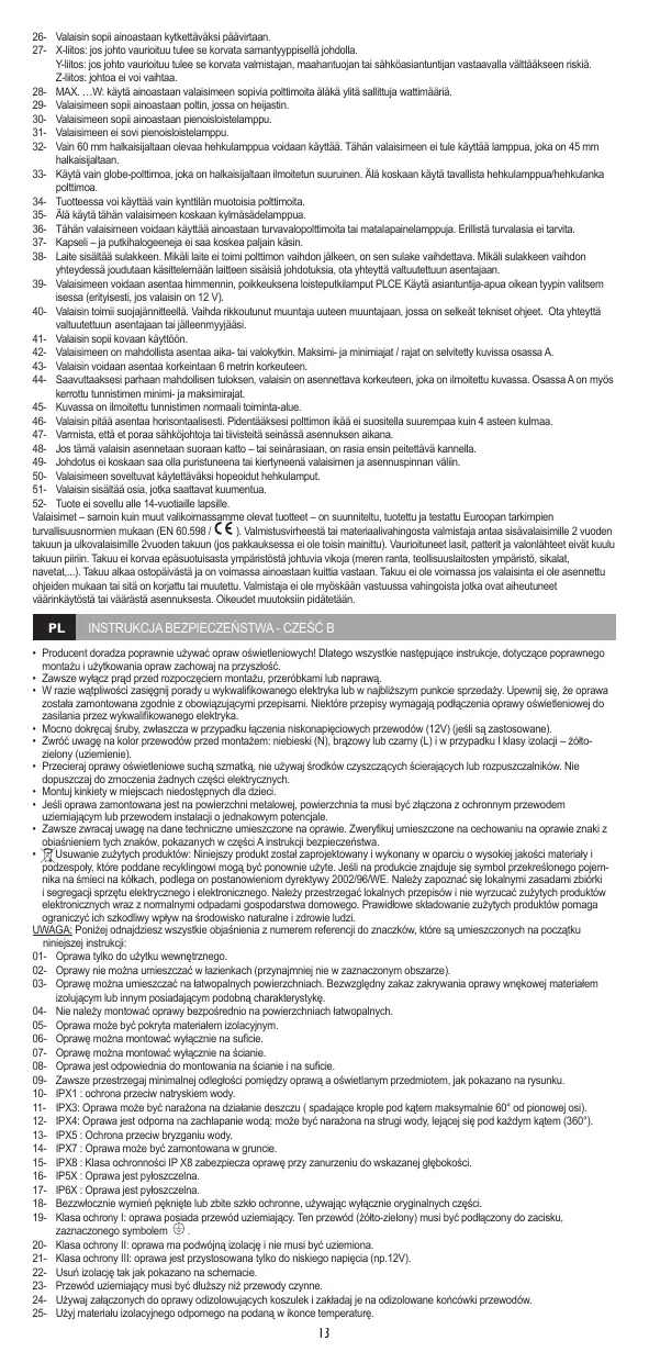 • Si vous avez un doute, demandez conseil à un électricien ou au vendeur. Assurez vous que vous installez toujours les articles suivant la réglementation en vigueur. Certaines règlementations imposent l’installation de certains articles par un électricien qualifié. (ex. en Allemagne). • Serrez toujours fermement les écrous de fixation, plus spécialement les attaches pour les équipements en très basse tension (12V). • Vérifiez la bonne couleur des câbles de branchement. Bleu: neutre (N). Brun ou noir (L): positif, et si l’article est en classe I: vert et jaune pour la terre. • Installer les appliques hors de la portée des enfants • Si le luminaire est installé sur une surface métallique, celle-ci doit être reliée au fil de terre ou à une liaison équipotentielle de l'installation. • Le nettoyage des articles d’éclairage se fait avec un chiffon sec, n’utilisez pas de solvants ou de produits abrasifs. Evitez les projections de liquides sur les parties électriques. • Prenez toujours en compte les spécifications techniques de l’équipement. Vérifiez les icônes sur l’étiquette argentée de l’article et les icônes que nous vous expliquons sur la partie A de votre notice de sécurité. • Mise au rebut des produits en fin de vie: Ce produit a été conçu et fabriqué avec des matériaux et composants recyclables de haute qualité. Le symbole d'une poubelle barrée apposé sur un produit signifie que ce dernier répond aux exigences de la directive européenne 2002/96/EC. Informez-vous auprès des instances locales sur le système de collecte des produits électriques et électroniques en fin de vie. Conformez-vous à la législation en vigueur et ne jetez pas vos produits avec les déchets ménagers. Seule une mise au rebut adéquate des produits peut empêcher la contamination de l'environnement et ses effets nocifs sur la santé. ATTENTION: vous trouverez ci-après toutes les explications avec des références numériques correspondant respectivement aux instructions de sécurité. 01- Installation intérieure seulement 02- L’équipement ne convient pas pour une installation dans les salles de bains (au moins pas dans les zones spécifiées). 03- L’équipement peut être installé sur des surfaces normalement inflammables.Les luminaires encastrés ne doivent en aucune manière être recouverts de matériaux isolants ou assimilés. 04- Ce produit n'est pas adapté pour un montage direct sur des surfaces inflammables. 05- L'article peut être recouvert de matériaux isolants. 06- L’équipement ne peut être fixé que sur un plafond. 07- L’équipement n’est fixable qu’au mur. 08- L'article est prévu pour être accroché au mur ou au plafond. 09- Respectez toujours la distance minimale entre la lampe et les objets éclairés comme indiqué sur l’icône. 10- IPX1 : L'article est protégé contre les chuttes d'eau verticales. 11- IPX3 : l’équipement peut être exposé à la pluie (gouttes de pluie tombant dans un angle de 60° maximum par rapport à l’axe). 12- IPX4 : L’équipement est résistant aux projections d’eau: il peut être exposé à toute projection d’eau venant de n’importe quelle direction (360°). 13- IPX5 : L'article est protégé contre les jets d'eau. 14- IPX7 : Protection partielle contre l'immersion (jusqu'à 1mètre) 15- IPX8 : Offre une protection contre l’immersion jusqu’à la profondeur indiquée. 16- IP5X : L'article est protégé contre les poussières. 17- IP6X : L'article est étanche aux poussières. 18- Remplacez immédiatement un verre de sécurité fissuré ou cassé et n’utilisez que des éléments approuvés par le constructeur. 19- Protection de classe I : l'équpement a une connexion à la prise de terre. Le câble de terre (jaune et vert) doit être connecté au clip marqué du symbole . 20- Protection de classe II: l’équipement a une double protection et ne doit pas être connecté à la prise de terre. 21- Protection de classe III: L’équipement n’est prévu que pour des articles de très basse tension (12V). 22- Installer les fils comme indiqué sur le schéma. 23- Le câble de terre doit toujours être plus long que les câbles de contact. 24- L’utilisation d’un matériau supplémentaire pour protéger de la chaleur est requis sur les câbles non protégés. 25- Utilisez le câble calorifo-résistant pour faire l’installation secteur. 26- L’équipement n’est prévu que pour un branchement direct au réseau. 27- X-connection : en cas de dommages, effectuer le remplacement par le même câble. Y-connection : en cas de dommages du câble, il doit être remplacé par le fabricant, son service après vente ou une personne de qualification similaire afin d'éviter tout danger. Z-connexion : Le câble ne peut faire l’objet d’un remplacement 28- MAX. …W: n’utilisez pas d’ampoule d’une puissance supérieure à celle indiquée sur l’étiquette du produit. 29- L’équipement ne convient qu’à des ampoules avec réflecteurs. 30- Seule les ampoules PLCE peuvent être utilisées dans cet équipement. 31- Vous ne pouvez pas mettre d’ampoule PLCE dans cet article. 32- Seule une lampe incandescente de diamètre 60 mm peut être utilisée pour cet article. Une lampe de 45 mm ne peut l’être. 33- Utiliser uniquement une ampoule à incandescence de la taille indiquée. Ne jamais utiliser une ampoule à incandescence standard. 34- Ce produit est uniquement adapté pour les ampoules de forme flamme. 35- Ne jamais utiliser d’ampoule à faisceaux froids. 36- Ne conviennent pour cette installation que les lampes de type protection incorporée ou à faible tension. Une protection supplémentaire en verre n’est pas nécessaire. 37- Les ampoules bispina et barrettes halogènes ne doivent pas êtres touchées à mains nues. 38- Ce luminiare est équipé d'un fusible. Dans le cas où le luminaire ne fonctionne toujours pas après changement de l'ampoule, le fus