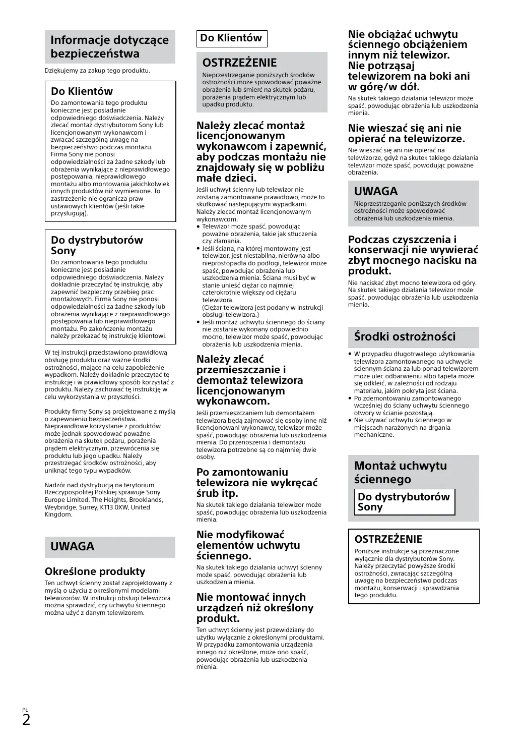 SU-WL450 - Uchwyt ścienny do telewizora SONY - Bezpłatna instrukcja obsługi