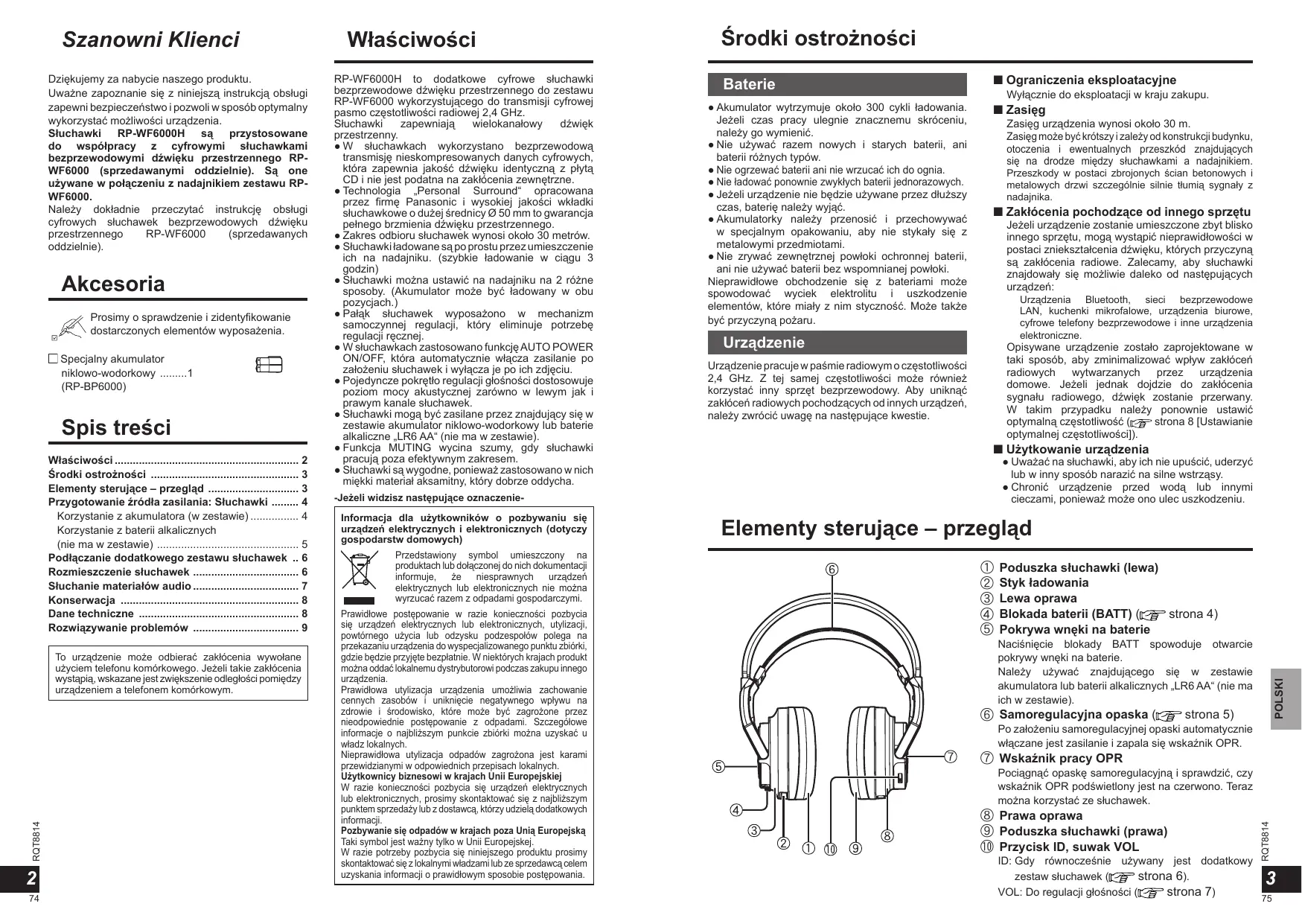 RP-WF6000H to dodatkowe cyfrowe słuchawki bezprzewodowe dźwięku przestrzennego do zestawu RP-WF6000 wykorzystującego do transmisji cyfrowej pasmo częstotliwości radiowej 2,4 GHz. Słuchawki zapewniają wielokanałowy dźwięk przestrzenny. ● W słuchawkach wykorzystano bezprzewodową transmisję nieskompresowanych danych cyfrowych, która zapewnia jakość dźwięku identyczną z płytą CD i nie jest podatna na zakłócenia zewnętrzne. ● Technologia „Personal Surround“ opracowana przez firmę Panasonic i wysokiej jakości wkładki słuchawkowe o dużej średnicy Ø 50 mm to gwarancja pełnego brzmienia dźwięku przestrzennego. ● Zakres odbioru słuchawek wynosi około 30 metrów. ● Słuchawki ładowane są po prostu przez umieszczenie ich na nadajniku. (szybkie ładowanie w ciągu 3 godzin) ● Słuchawki można ustawić na nadajniku na 2 różne sposoby. (Akumulator może być ładowany w obu pozycjach.) ● Pałąk słuchawek wyposażono w mechanizm samoczynnej regulacji, który eliminuje potrzebę regulacji ręcznej. ● W słuchawkach zastosowano funkcję AUTO POWER ON/OFF, która automatycznie włącza zasilanie po założeniu słuchawek i wyłącza je po ich zdjęciu. ● Pojedyncze pokrętło regulacji głośności dostosowuje poziom mocy akustycznej zarówno w lewym jak i prawym kanale słuchawek. ● Słuchawki mogą być zasilane przez znajdujący się w zestawie akumulator niklowo-wodorkowy lub baterie alkaliczne „LR6 AA“ (nie ma w zestawie). ● Funkcja MUTING wycina szumy, gdy słuchawki pracują poza efektywnym zakresem. ● Słuchawki są wygodne, ponieważ zastosowano w nich miękki materiał aksamitny, który dobrze oddycha. Środki ostrożności Baterie ● Akumulator wytrzymuje około 300 cykli ładowania. Jeżeli czas pracy ulegnie znacznemu skróceniu, należy go wymienić. ● Nie używać razem nowych i starych baterii, ani baterii różnych typów. ● Nie ogrzewać baterii ani nie wrzucać ich do ognia. ● Nie ładować ponownie zwykłych baterii jednorazowych. ● Jeżeli urządzenie nie będzie używane przez dłuższy czas, baterię należy wyjąć. ● Akumulatorky należy przenosić i przechowywać w specjalnym opakowaniu, aby nie stykały się z metalowymi przedmiotami. ● Nie zrywać zewnętrznej powłoki ochronnej baterii, ani nie używać baterii bez wspomnianej powłoki. Nieprawidłowe obchodzenie się z bateriami może spowodować wyciek elektrolitu i uszkodzenie elementów, które miały z nim styczność. Może także być przyczyną pożaru. n Ograniczenia eksploatacyjne Wyłącznie do eksploatacji w kraju zakupu. n Zasięg Zasięg urządzenia wynosi około 30 m. Zasięg może być krótszy i zależy od konstrukcji budynku, otoczenia i ewentualnych przeszkód znajdujących się na drodze między słuchawkami a nadajnikiem. Przeszkody w postaci zbrojonych ścian betonowych i metalowych drzwi szczególnie silnie tłumią sygnały z nadajnika. n Zakłócenia pochodzące od innego sprzętu Jeżeli urządzenie zostanie umieszczone zbyt blisko innego sprzętu, mogą wystąpić nieprawidłowości w postaci zniekształcenia dźwięku, których przyczyną są zakłócenia radiowe. Zalecamy, aby słuchawki znajdowały się możliwie daleko od następujących urządzeń: Urządzenia Bluetooth, sieci bezprzewodowe LAN, kuchenki mikrofalowe, urządzenia biurowe, cyfrowe telefony bezprzewodowe i inne urządzenia elektroniczne. Urządzenie Opisywane urządzenie zostało zaprojektowane w taki sposób, aby zminimalizować wpływ zakłóceń radiowych wytwarzanych przez urządzenia domowe. Jeżeli jednak dojdzie do zakłócenia sygnału radiowego, dźwięk zostanie przerwany. W takim przypadku należy ponownie ustawić optymalną częstotliwość ( strona 8 [Ustawianie optymalnej częstotliwości]). Urządzenie pracuje w paśmie radiowym o częstotliwości 2,4 GHz. Z tej samej częstotliwości może również korzystać inny sprzęt bezprzewodowy. Aby uniknąć zakłóceń radiowych pochodzących od innych urządzeń, należy zwrócić uwagę na następujące kwestie. n Użytkowanie urządzenia ● Uważać na słuchawki, aby ich nie upuścić, uderzyć lub w inny sposób narazić na silne wstrząsy. ● Chronić urządzenie przed wodą lub innymi cieczami, ponieważ może ono ulec uszkodzeniu. -Jeżeli widzisz następujące oznaczenieInformacja dla użytkowników o pozbywaniu się urządzeń elektrycznych i elektronicznych (dotyczy gospodarstw domowych) Przedstawiony symbol umieszczony na produktach lub dołączonej do nich dokumentacji informuje, że niesprawnych urządzeń elektrycznych lub elektronicznych nie można wyrzucać razem z odpadami gospodarczymi. Prawidłowe postępowanie w razie konieczności pozbycia się urządzeń elektrycznych lub elektronicznych, utylizacji, powtórnego użycia lub odzysku podzespołów polega na przekazaniu urządzenia do wyspecjalizowanego punktu zbiórki, gdzie będzie przyjęte bezpłatnie. W niektórych krajach produkt można oddać lokalnemu dystrybutorowi podczas zakupu innego urządzenia. Prawidłowa utylizacja urządzenia umożliwia zachowanie cennych zasobów i uniknięcie negatywnego wpływu na zdrowie i środowisko, które może być zagrożone przez nieodpowiednie postępowanie z odpadami. Szczegółowe informacje o najbliższym punkcie zbiórki można uzyskać u władz lokalnych. Nieprawidłowa utylizacja odpadów zagrożona jest karami przewidzianymi w odpowiednich przepisach lokalnych. Użytkownicy biznesowi w krajach Unii Europejskiej W razie konieczności pozbycia się urządzeń elektrycznych lub elektronicznych, prosimy skontaktować się z najbliższym punktem sprzedaży lub z dostawcą, którzy udzielą dodatkowych informacji. Pozbywanie się odpadów w krajach poza Unią Europejską Taki symbol jest ważny tylko w Unii Europejskej. W razie potrzeby pozbycia się niniejszego produktu prosimy skontaktować się z lokalnymi władzami lub ze sprzedawcą celem uzyskania informacji o pr