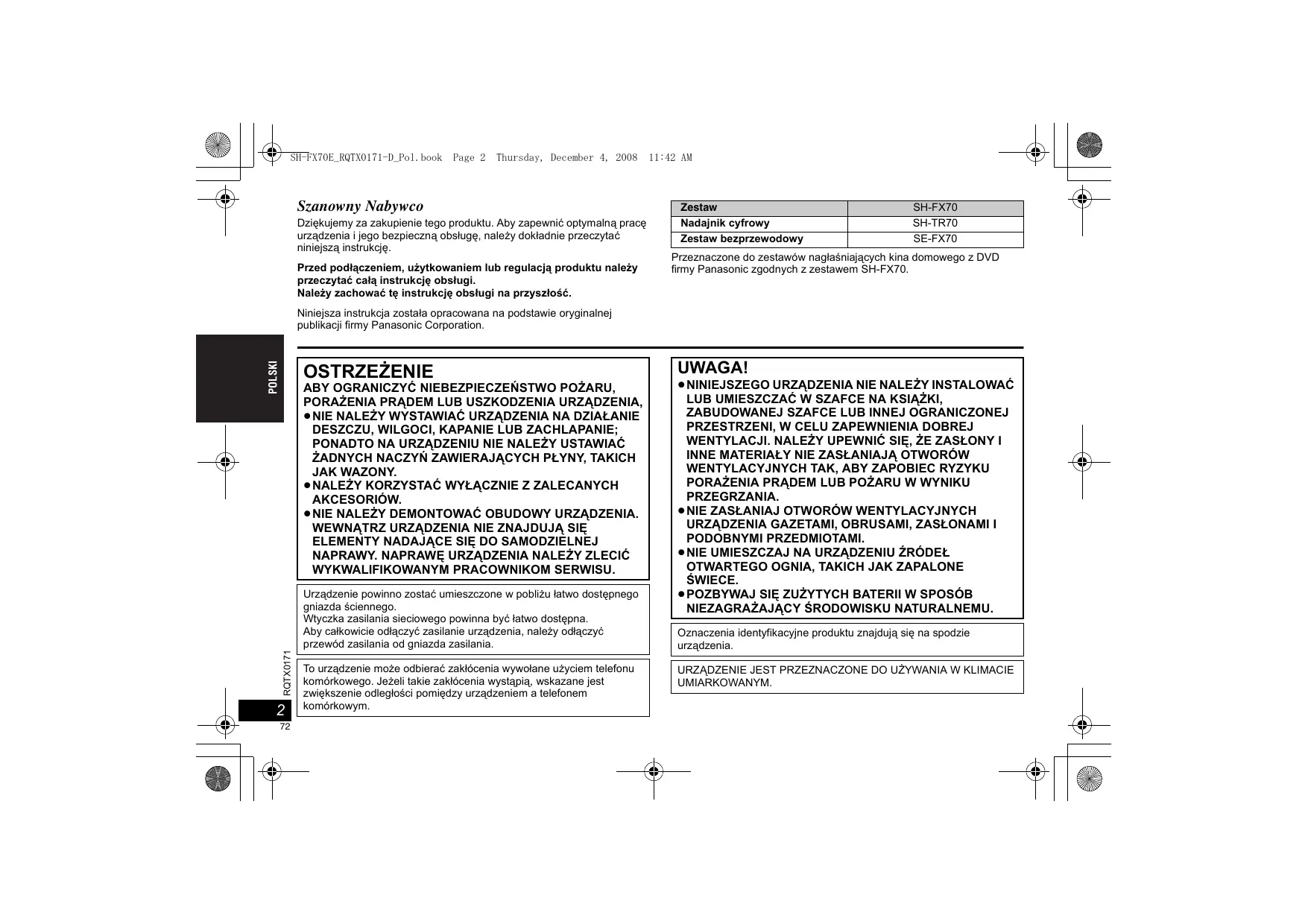 SH-FX70E_RQTX0171-D_Pol.book Page 2 Thursday, December 4, 2008 Szanowny Nabywco Dziękujemy za zakupienie tego produktu. Aby zapewnić optymalną pracę urządzenia i jego bezpieczną obsługę, należy dokładnie przeczytać niniejszą instrukcję. Przed podłączeniem, użytkowaniem lub regulacją produktu należy przeczytać całą instrukcję obsługi. Należy zachować tę instrukcję obsługi na przyszłość. 11:42 AM Zestaw Nadajnik cyfrowy Zestaw bezprzewodowy SH-FX70 SH-TR70 SE-FX70 Przeznaczone do zestawów nagłaśniających kina domowego z DVD firmy Panasonic zgodnych z zestawem SH-FX70. Niniejsza instrukcja została opracowana na podstawie oryginalnej publikacji firmy Panasonic Corporation. POLSKI OSTRZEŻENIE RQTX0171 ABY OGRANICZYĆ NIEBEZPIECZEŃSTWO POŻARU, PORAŻENIA PRĄDEM LUB USZKODZENIA URZĄDZENIA, ≥NIE NALEŻY WYSTAWIAĆ URZĄDZENIA NA DZIAŁANIE DESZCZU, WILGOCI, KAPANIE LUB ZACHLAPANIE; PONADTO NA URZĄDZENIU NIE NALEŻY USTAWIAĆ ŻADNYCH NACZYŃ ZAWIERAJĄCYCH PŁYNY, TAKICH JAK WAZONY. ≥NALEŻY KORZYSTAĆ WYŁĄCZNIE Z ZALECANYCH AKCESORIÓW. ≥NIE NALEŻY DEMONTOWAĆ OBUDOWY URZĄDZENIA. WEWNĄTRZ URZĄDZENIA NIE ZNAJDUJĄ SIĘ