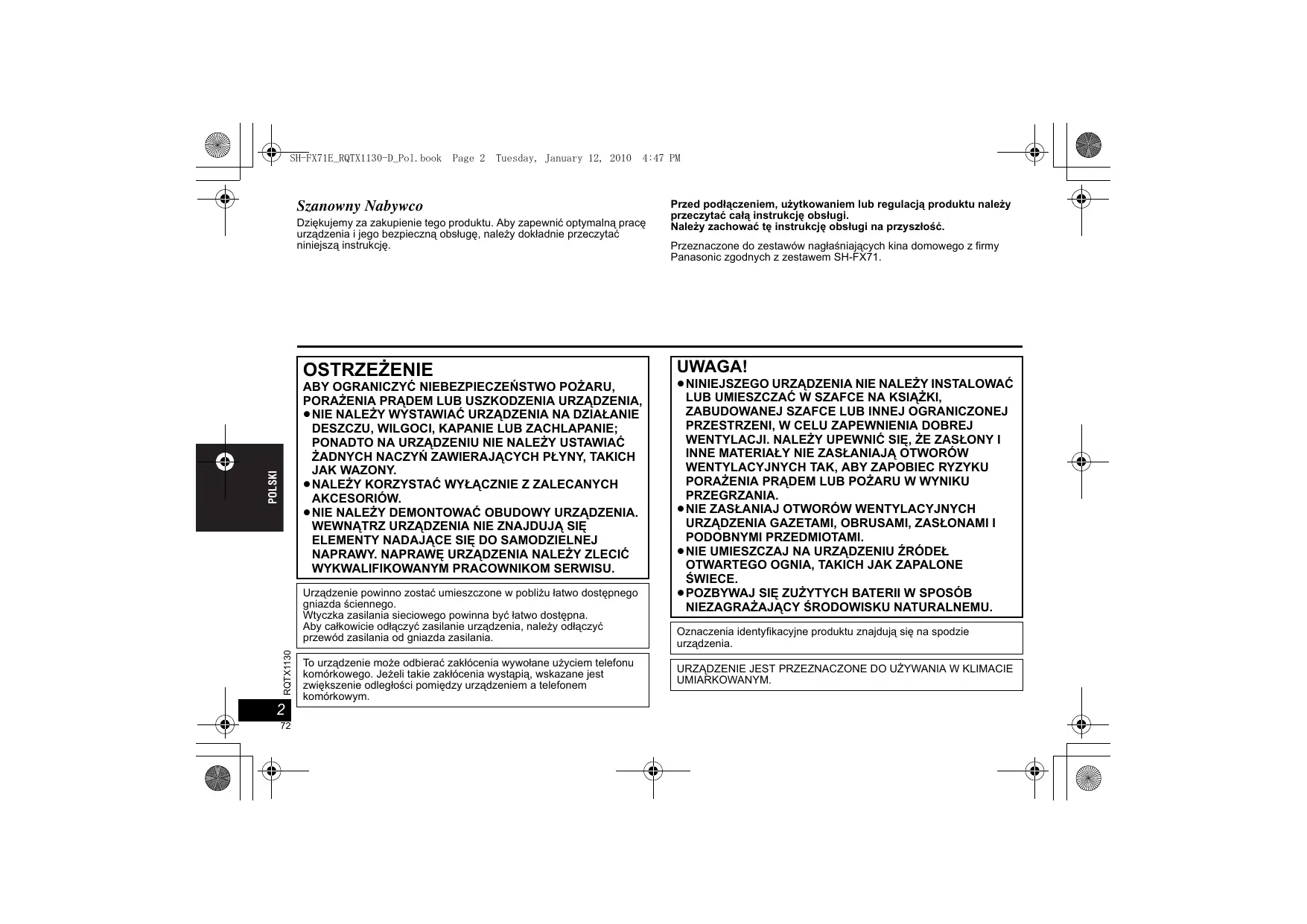 To urządzenie może odbierać zakłócenia wywołane użyciem telefonu komórkowego. Jeżeli takie zakłócenia wystąpią, wskazane jest zwiększenie odległości pomiędzy urządzeniem a telefonem komórkowym. Przed podłączeniem, użytkowaniem lub regulacją produktu należy przeczytać całą instrukcję obsługi. Należy zachować tę instrukcję obsługi na przyszłość. Przeznaczone do zestawów nagłaśniających kina domowego z firmy Panasonic zgodnych z zestawem SH-FX71. UWAGA! ≥NINIEJSZEGO URZĄDZENIA NIE NALEŻY INSTALOWAĆ LUB UMIESZCZAĆ W SZAFCE NA KSIĄŻKI,