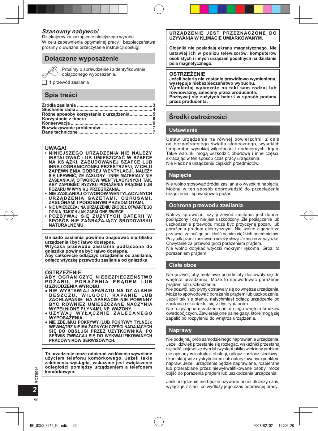 - 2007/02/02 13:06:19 Szanowny nabywco! Dziękujemy za zakupienie niniejszego wyrobu. W celu zapewnienia optymalnej pracy i bezpieczeństwa prosimy o uważne przeczytanie instrukcji obsługi. Dołączone wyposażenie Prosimy o sprawdzenie i zidentyfikowanie dołączonego wyposażenia. 1 przewód zasilania Spis treści Źródła zasilania p. 3